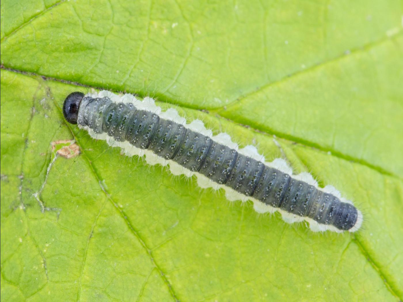Larve : 12,0 à 14,0 mm à maturité; la jeune larve est brun-beige, teintée de rose, tandis que la larve plus mature est très foncée sur le dos et blanchâtre sur le ventre; la tête est brun foncé et ornée de soies; les soies latérales sont blanchâtres et sont portées sur des tubercules.