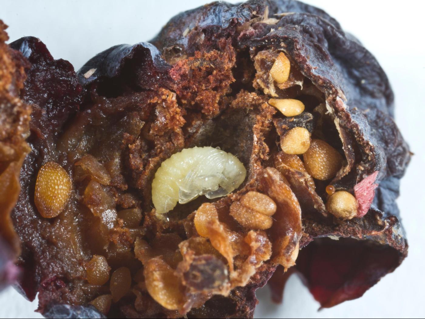 Cette espèce est associée aux plantes du genre Vaccinium. L'adulte cause l'apparition de taches brunes sur les fruits en grignotant la surface de ceux-ci. Ce sont cependant les larves qui causent les dommages les plus considérables dans les cultures de petits fruits, principalement le bleuet en corymbe. Les fruits infestés par les larves mûrissent anormalement, se déforment et tombent de façon prématurée. Cet insecte cause des infestations sporadiques qui peuvent se solder par une baisse de rendements. Il n'est cependant pas considéré comme étant un ravageur d'importance puisque les dommages qu'ils causent sont généralement limités à de petites surfaces.