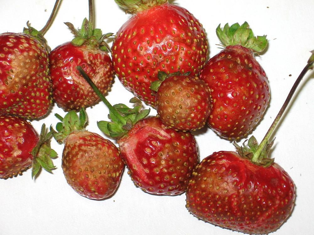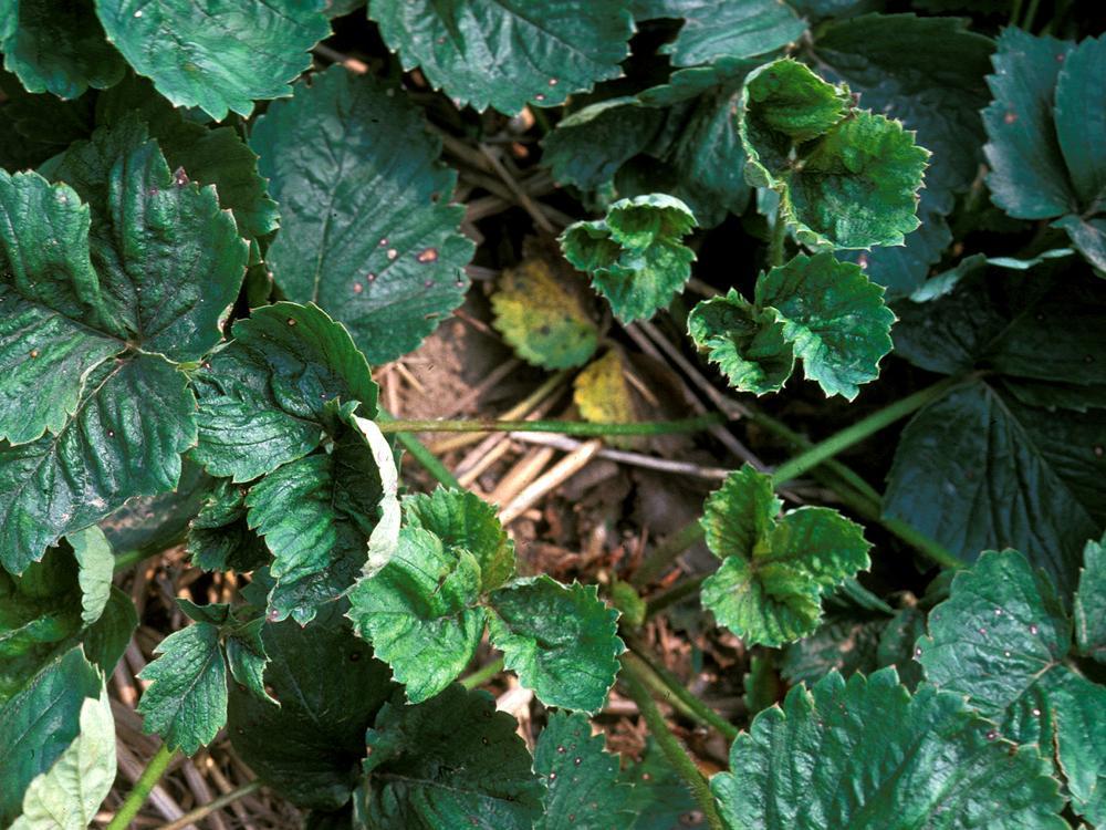 Description: Feuillages de fraisier présentant des dommages causés par l'alimentation de tarsonèmes du fraisier. Ces acariens s'attaquent d'abord aux jeunes feuilles au coeur du plant. En plus d'induire un retard de croissance, les feuilles deviennent crispées, recroquevillées et d'aspect terne, jauni ou rougeâtre. Il en découle parfois un stress diminuant la productivité des plants ou augmentant leur sensibilité aux stress hydriques.