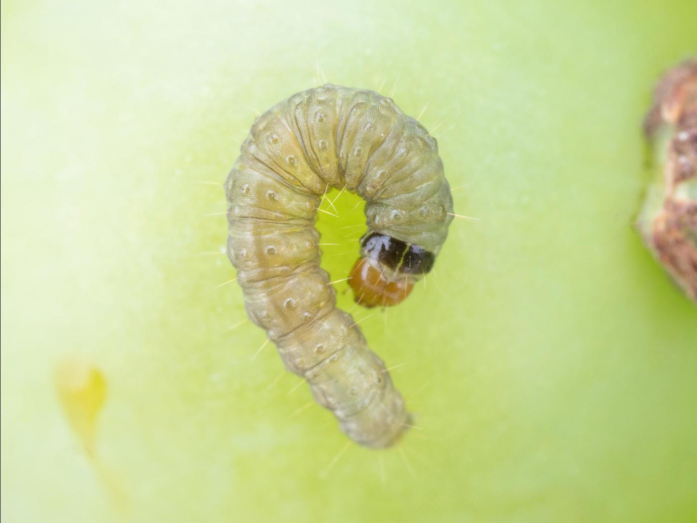Larve : 10,0 à 15,0 mm à maturité; la tête est brune et la plaque thoracique est noire ou brun foncé; le reste du corps est verdâtre, brun ou pourpre; une ligne foncée est présente au centre du dos.