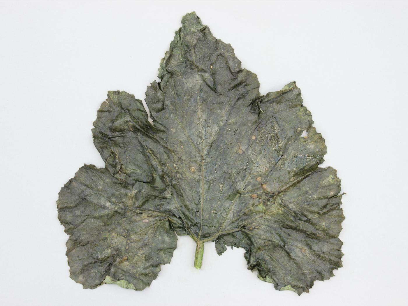 Feuille : sur les jeunes feuilles, les taches sont petites, aqueuses et plutôt rondes. Sur les feuilles plus âgées, les taches deviennent angulaires et délimitées par les nervures, jaunâtres à brunâtres et sèches. Par temps humide, un exsudat laiteux peut apparaître à la face inférieure. Le centre de la tache peut également tomber, donnant à la feuille une apparence criblée. Sur les cultivars sensibles, les taches ou les lésions sont souvent bordées d’un halo jaune.