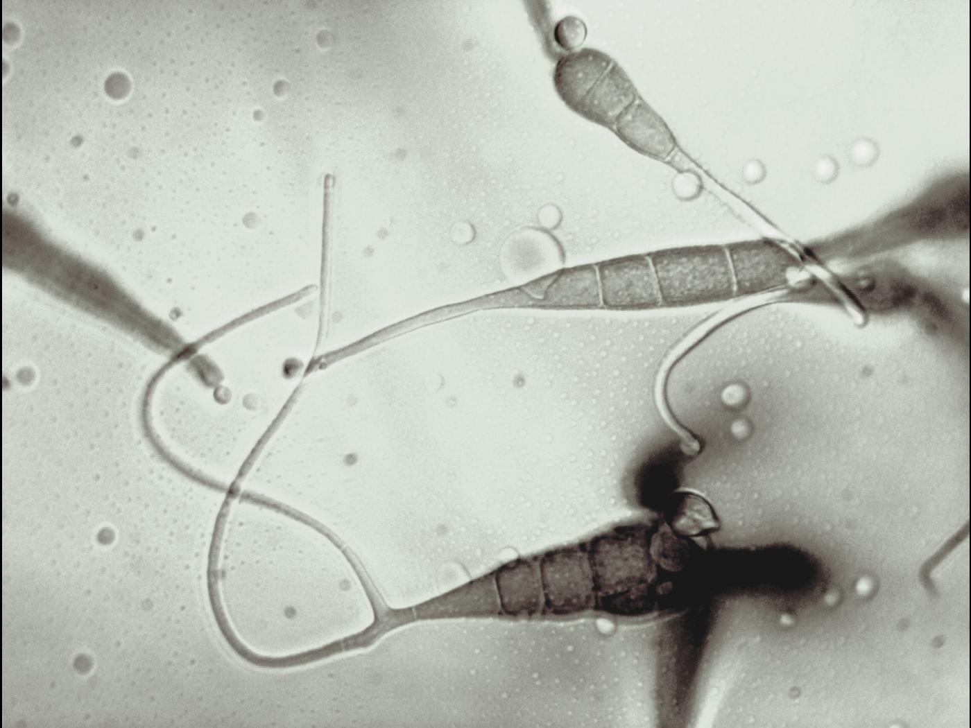 - Conidies : Dictyospores (7-12 septations transversales et de 0-5 septations longitudinales ou obliques). Très long rustrum effilé qui peut même se diviser en 2 ou 3 branches. Conidies solitaires (ne forment pas de chaînes). Dimension : 60-80 x 14-20 µm.