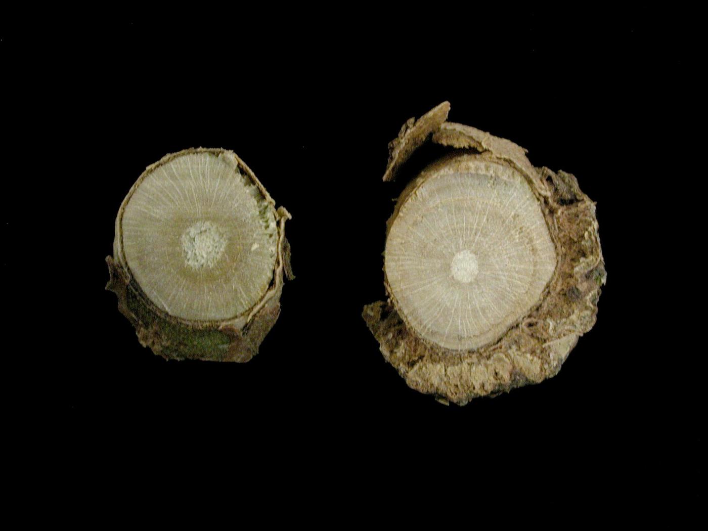 Tige : décoloration beige à brune du bois sous l’écorce, souvent sur un seul côté de la tige. Le brunissement est visible sur quelques cm de tige, mais parfois sur toute la longueur de la tige.