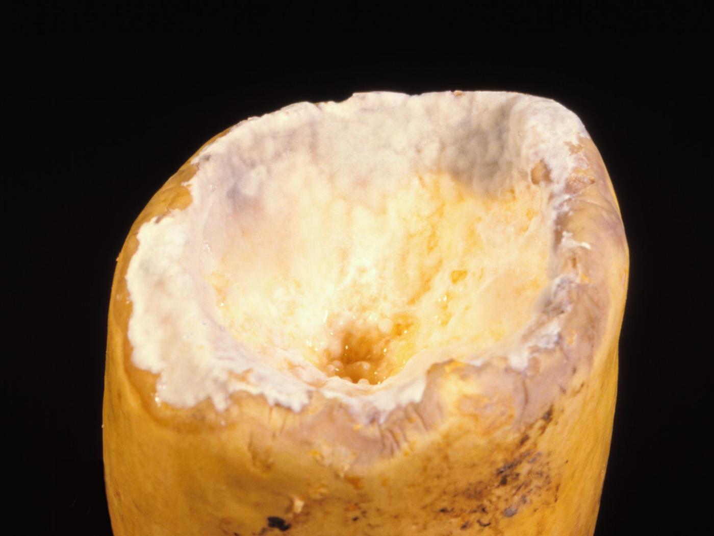 Description: Dans la zone pédonculaire d’une courge musquée 'Butternut' provenant d’un entrepôt, présence d’une importante pourriture aqueuse couverte d’un mycélium blanc grisâtre et inodore. Les tissus pourris se sont affaissés dans la chair et le pédoncule s’est facilement brisé. Les observations microscopiques ont révélé la présence du champignon Botrytis cinerea, responsable de la moisissure grise chez les cucurbitacées.