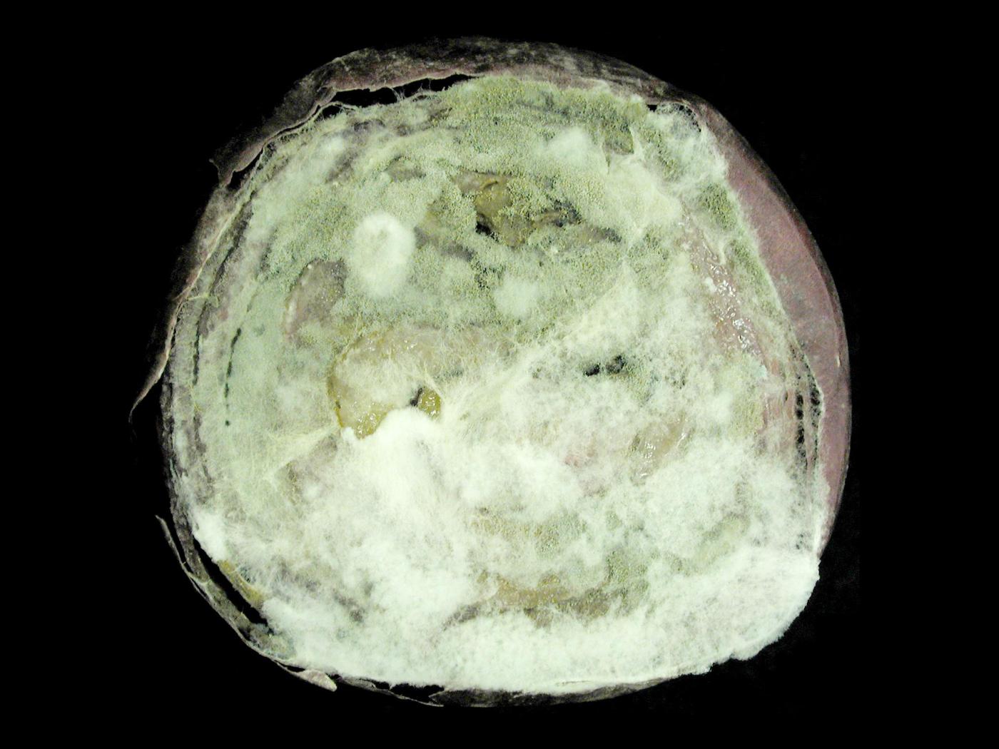 Légende: Zones déprimées et mycélium blanc sur tuniques sèches