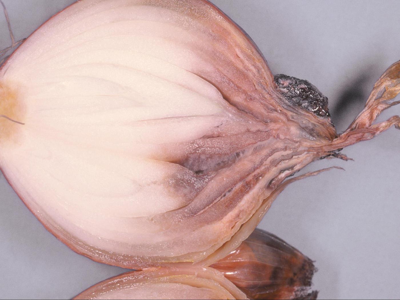 Bulbe : la pourriture débute au sommet des bulbes, près du col, et envahit ensuite les tuniques externes et internes, jusqu’au plateau racinaire. Les tuniques deviennent molles, humides et translucides. Les bulbes infectés sont plus légers. Présence d’une sporulation grisâtre et de sclérotes noirs sur et dans le bulbe. Le bulbe sèche puis se momifie.