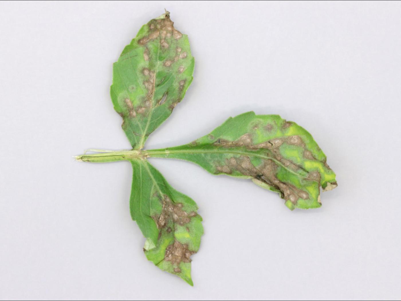 Feuille : présence de taches jaunes à brunes avec ou sans marge foncée. Un halo vert pâle à jaune entoure parfois les taches. Les taches mesurent généralement moins de 5 mm de diamètre. En vieillissant, les taches deviennent grises et se regroupent. Des fructifications noires du champignon sont visibles au centre des taches, ce qui fait paraître le centre surélevé. Les feuilles très infectées meurent et peuvent tomber. Les vieilles feuilles sont affectées en premier.