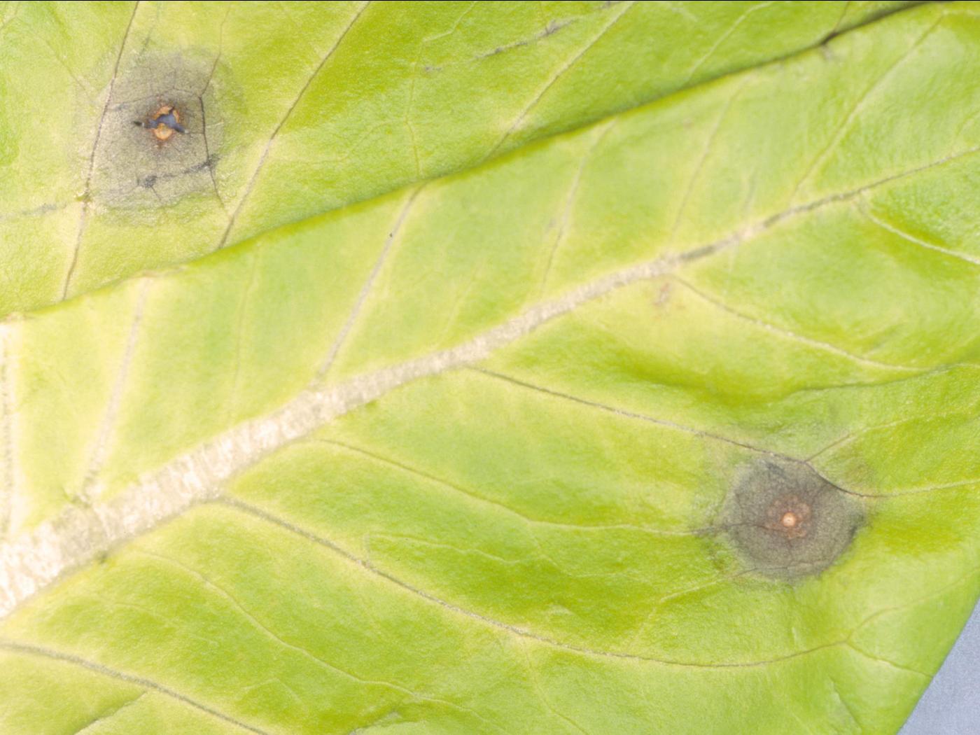 Feuille : présence de petites taches brunes entourées d’un halo vert pâle à jaune. En se développant, les taches deviennent beiges à brunes et irrégulières à angulaires. Un point blanc est fréquemment visible au centre des taches. Les taches ont un diamètre moyen supérieur à 1 cm et le centre des taches demeure pâle (0,5 à 1 mm de diamètre). Les grandes taches sont souvent localisées à la marge. Les taches bien développées sont légèrement déprimées et nécrotiques. Un duvet grisâtre, composé de structures fongiques du champignon, est parfois visible sur les deux faces de la feuille. Les tissus foliaires meurent lorsque la concentration de tache est trop élevée. Les symptômes se manifestent en premier sur les feuilles extérieures puis progressent vers les feuilles du cœur.
