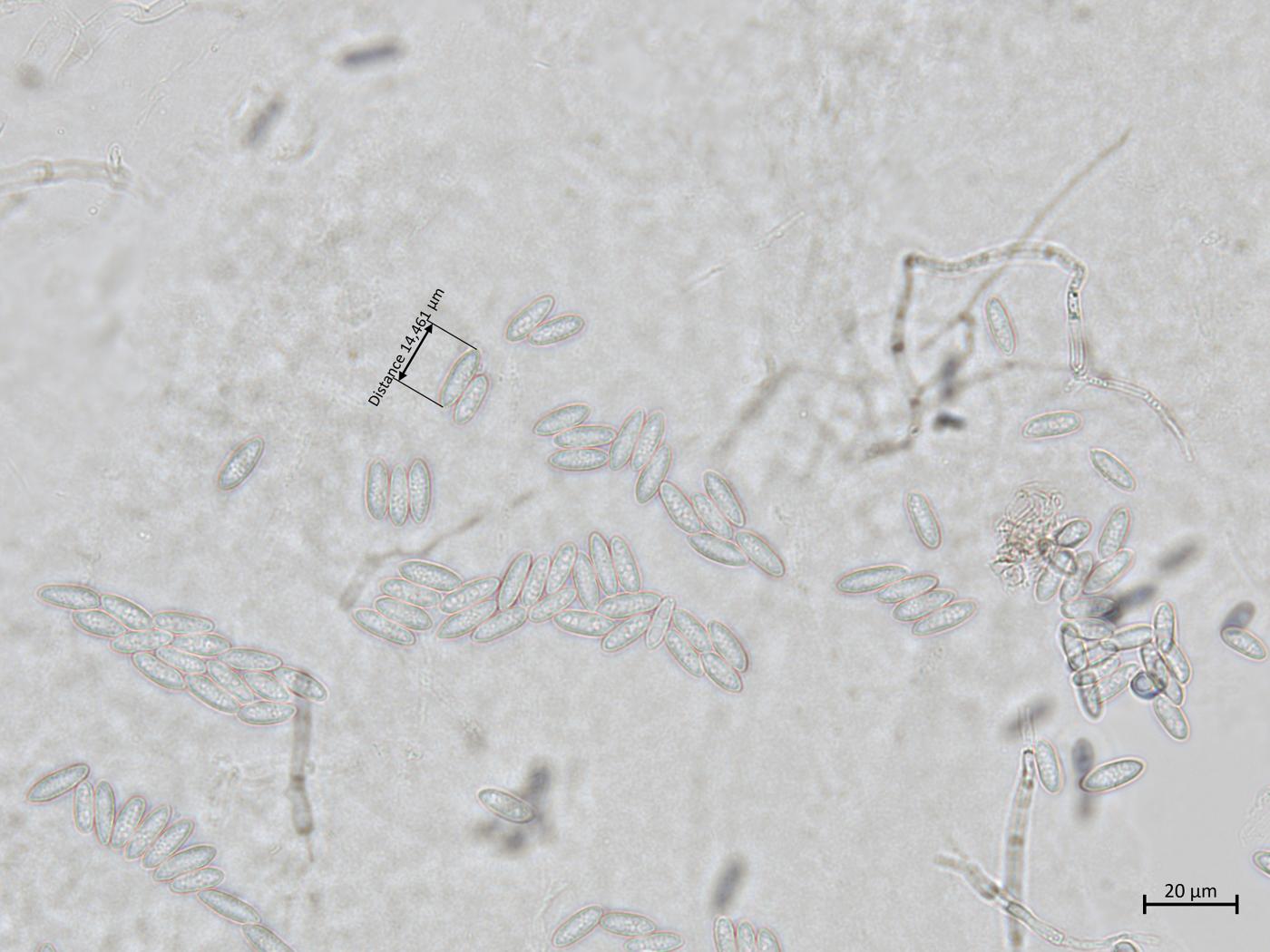 Mycélium : les hyphes sont hyalins, lisses, septés et ramifiés. Diamètre : 1-5,5 μm