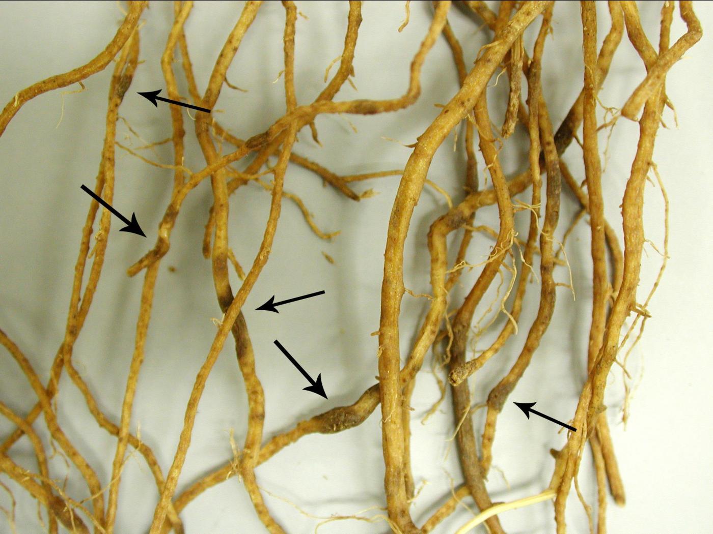 Description: Un système racinaire d’un plant de tomate (cv 'Trust') provenant d’une serre montre de petits segments ou manchons corticaux nécrosés (voir flèches). La plupart des racines sont blanches. Les observations microscopiques ont révélé la présence de microsclérotes du champignon Colletotrichum coccodes, responsable de l’anthracnose chez la tomate.