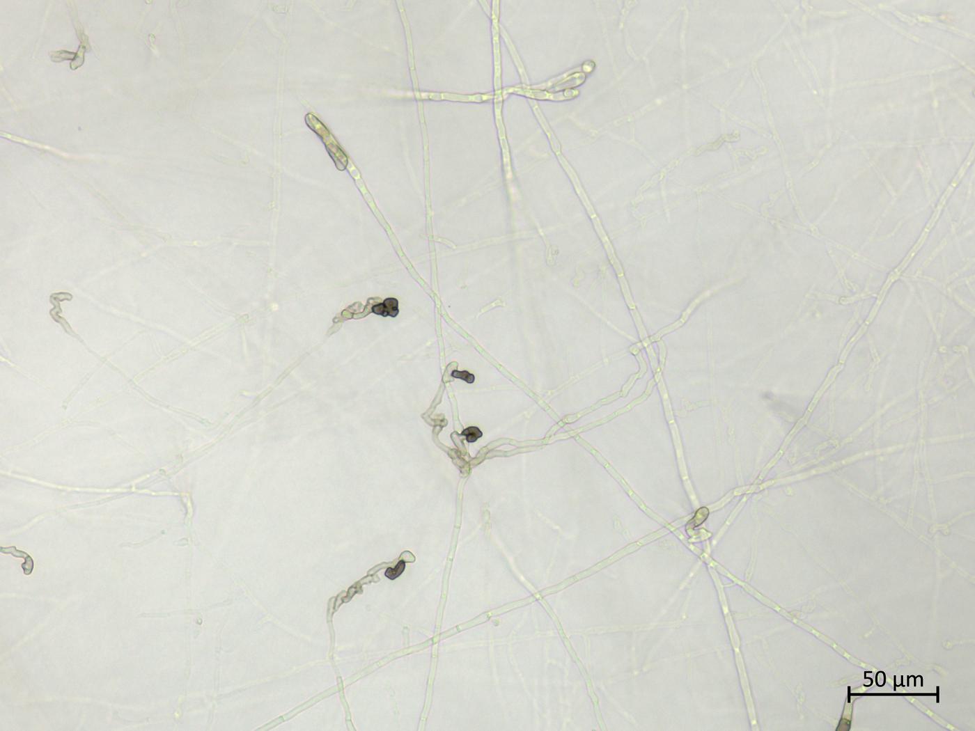 • Appressoria : Toujours présents (il s'agit d'un critère d'identification important). Brun pâle à brun foncé. Les appressoria se produisent suite à la germination des conidies. Visibles en dessous des mises en culture.