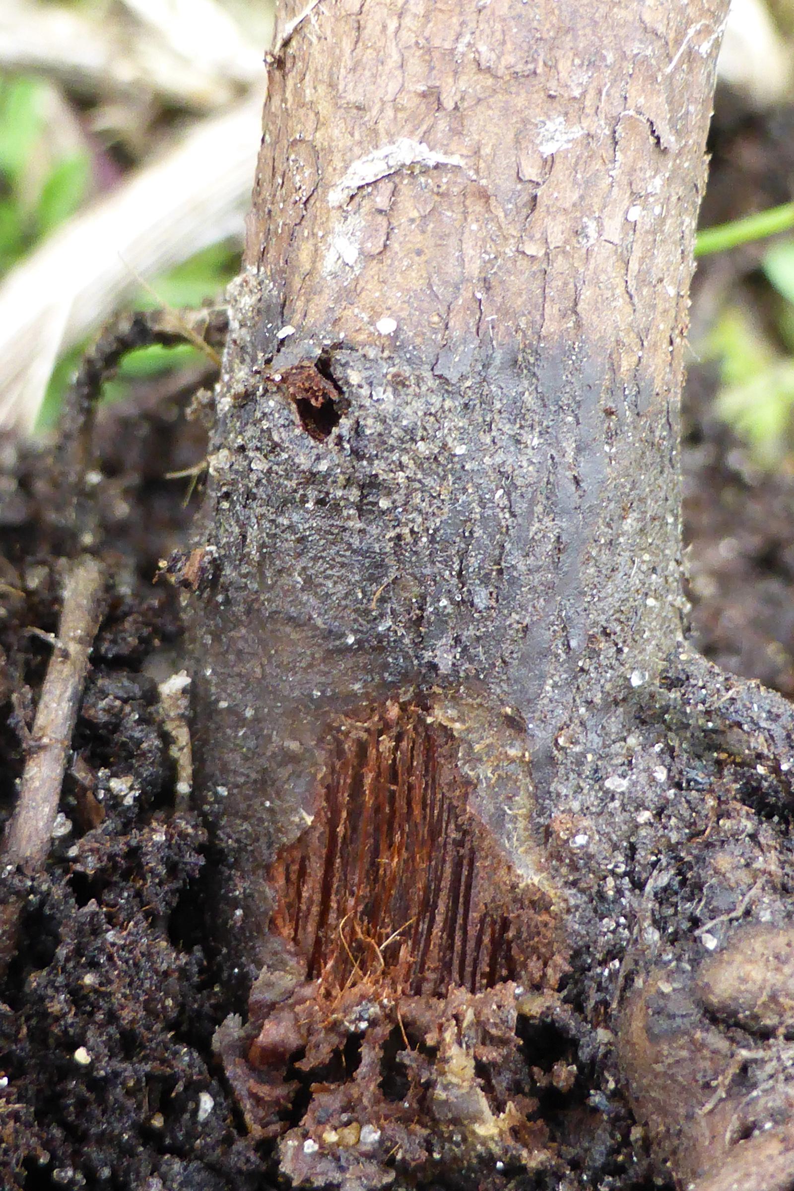 Collet : Noircissement du cambium et de la moelle.