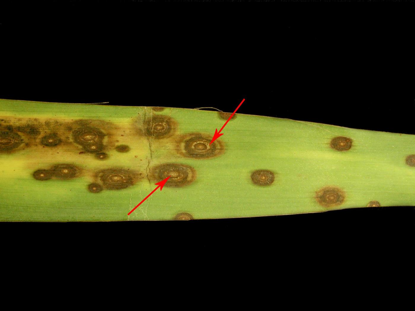 Feuille : sur les feuilles basales, présence de petites taches claires qui deviennent jaunes puis brun grisâtre lorsqu’elles sont matures. Elles sont elliptiques à concentriques (zonées) et distribuées de manière éparse à la face supérieure des feuilles. Une marge pourpre à noire se forme autour des vieilles taches qui ont généralement un diamètre inférieur à 5 mm. Un halo jaune entoure parfois les taches. Présence de pycnides noires au centre des taches déprimées. Les pycnides apparaissent environ 4 mois après l’infection et sont visibles à l’œil nu. Sur les feuilles gravement infectées, les taches fusionnent pour former de grandes plages d’aspect brûlé. Les feuilles meurent.