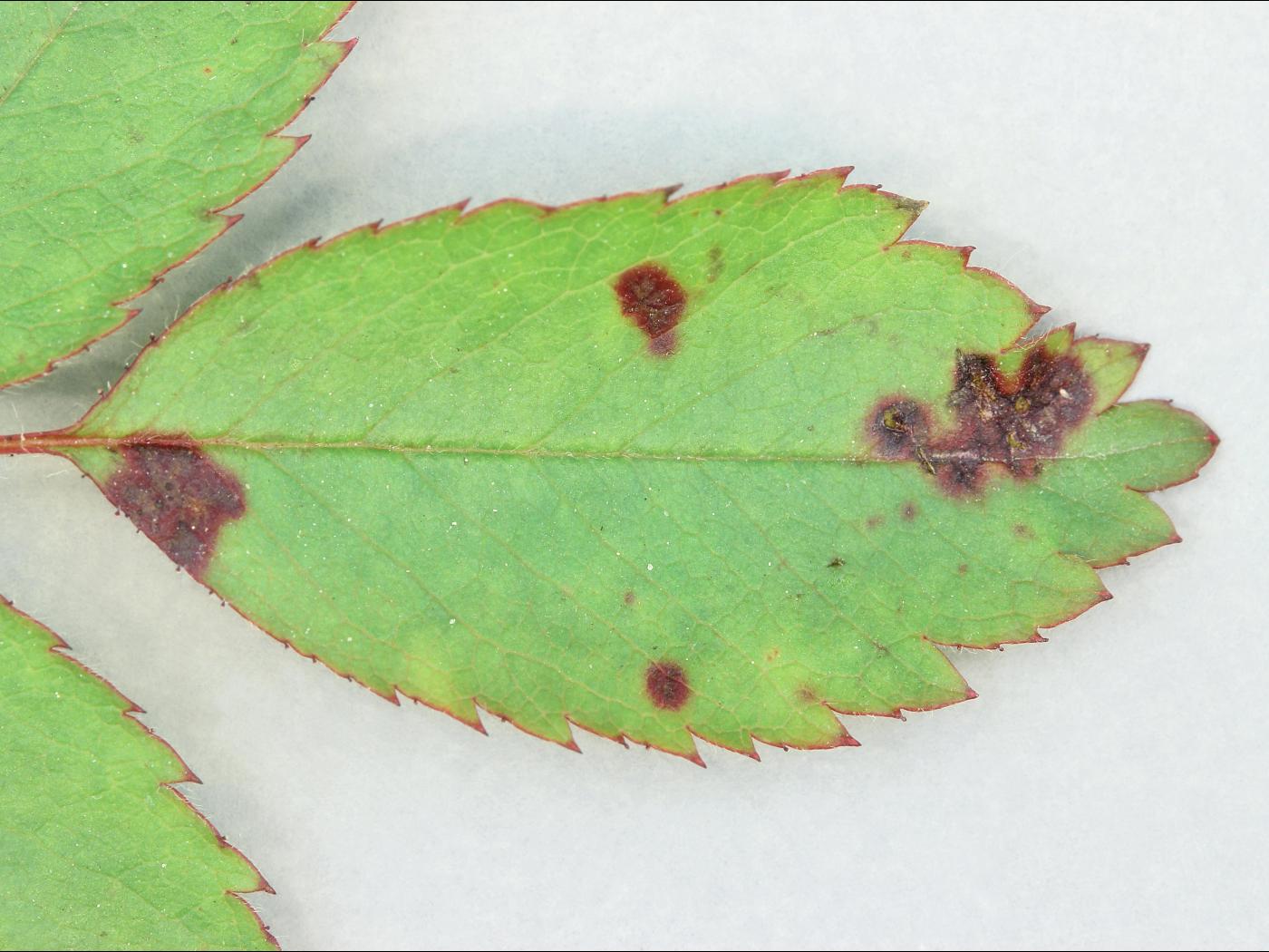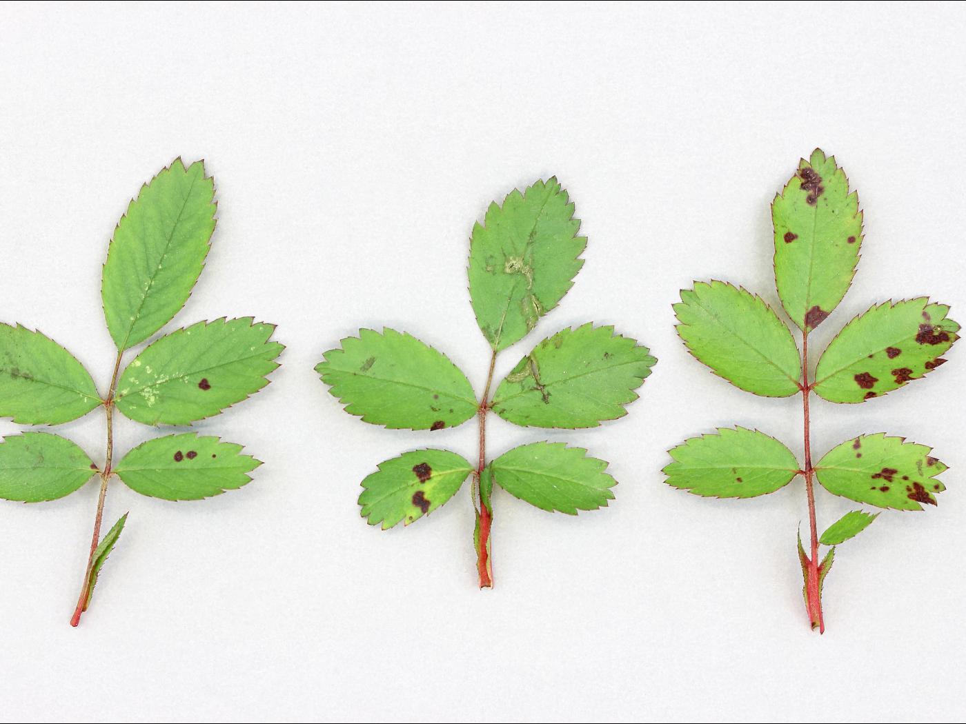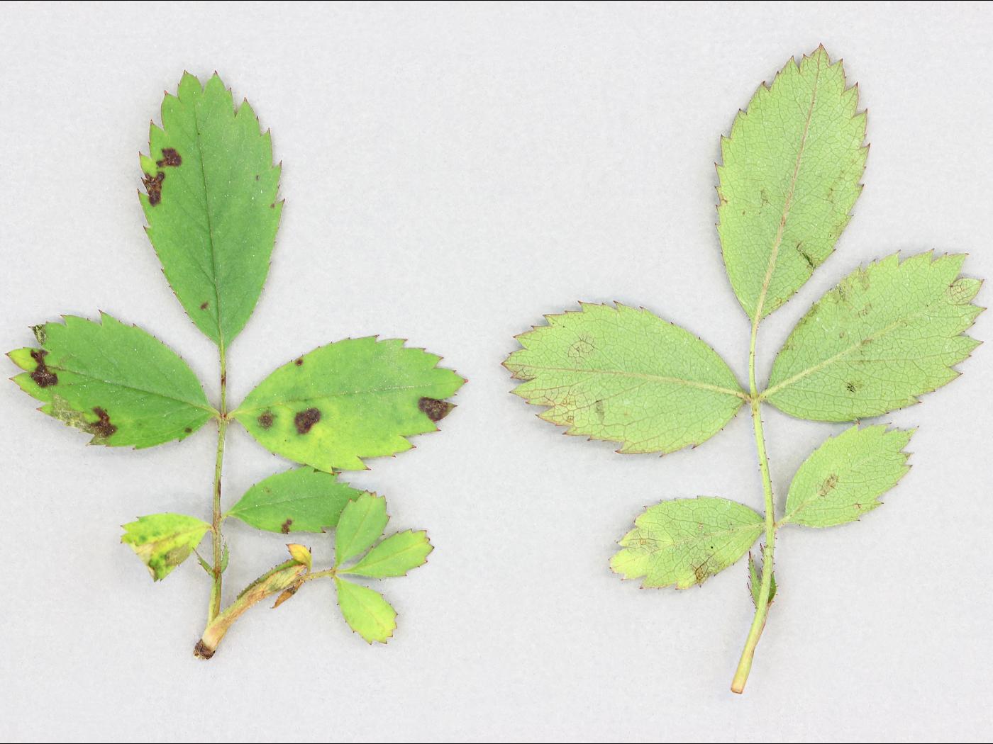 La tache noire du rosier est causée par le champignon Diplocarpon rosae. Ce champignon est spécifique au rosier. Il y a seulement quelques décennies, la maladie des taches noires était commune sur la plupart des variétés de rosiers cultivés et une maladie très importante. La tache noire, tout comme la rouille et le blanc, est de moins en moins fréquente chez les rosiers, surtout les rosiers arbustifs, grâce à une sélection rigoureuse lors de l’hybridation des rosiers. En serre, la tache noire du rosier est mineure, car les paramètres sont contrôlés (température, humidité, irrigation) tandis qu’en champ ou en pépinière, la maladie est toujours présente, mais moins fréquente. Des épidémies sont parfois observées lors de temps frais et humide. Dans ces cas, les plants affectés résistent moins bien aux rigueurs de l’hiver et à la sécheresse et le rendement en fleur diminue. Chez le rosier, le porte-greffe est résistant, c’est la greffe qui est responsable de la sensibilité. La tache noire affecte surtout la qualité esthétique des plants.