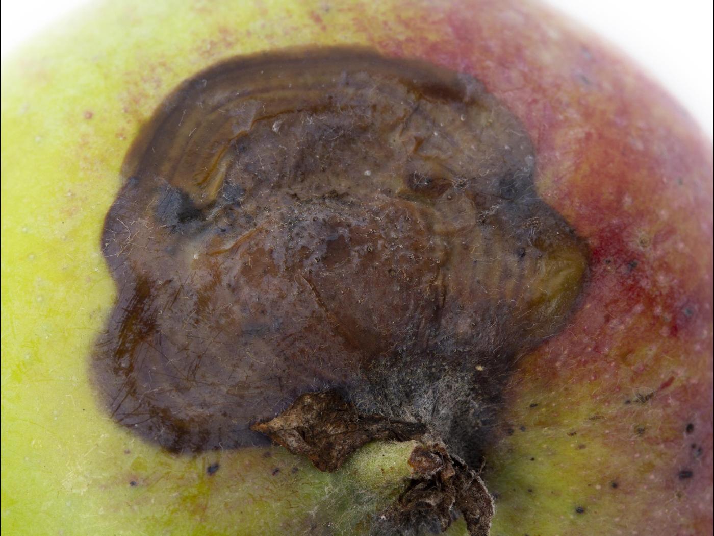 Description: Un fruit montre une tache circulaire de couleur brune et noire formant une dépression sur l'épiderme. Des anneaux concentriques successivement foncés et clair sont observables sur la tache.