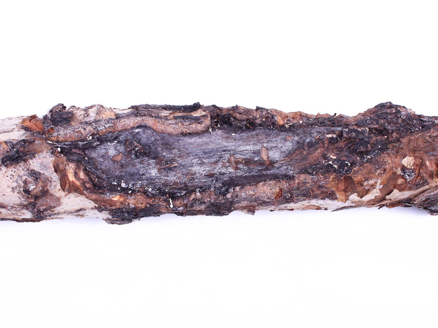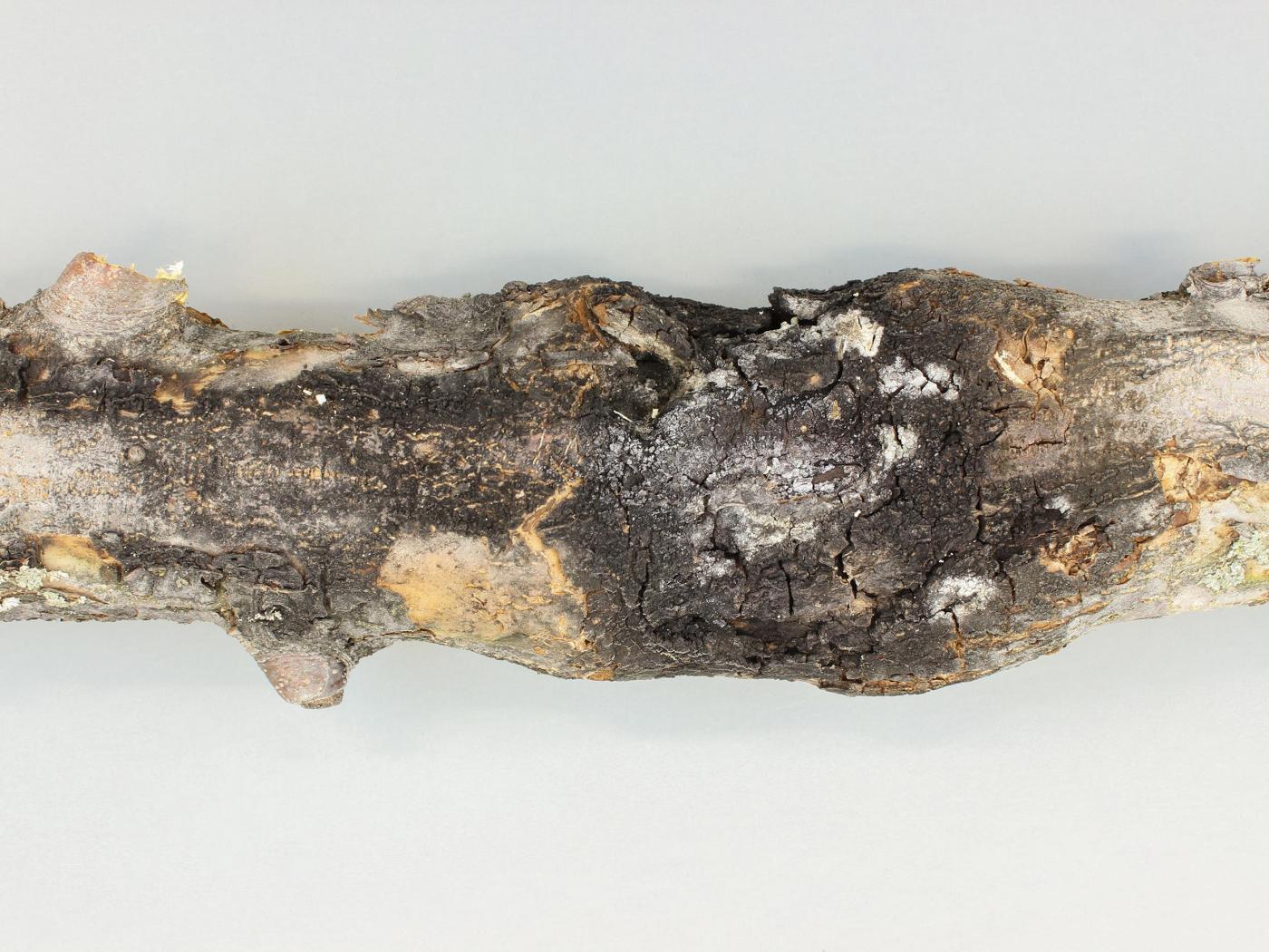 Description: Un segment de branche de pommier montre un chancre brun et une sporulation noire. Le chancre est parsemé de fissures et encercle la branche. Les tests de laboratoire ont révélé la présence du champignon Botryosphaeria sp., responsable du chancre à Diplodia.