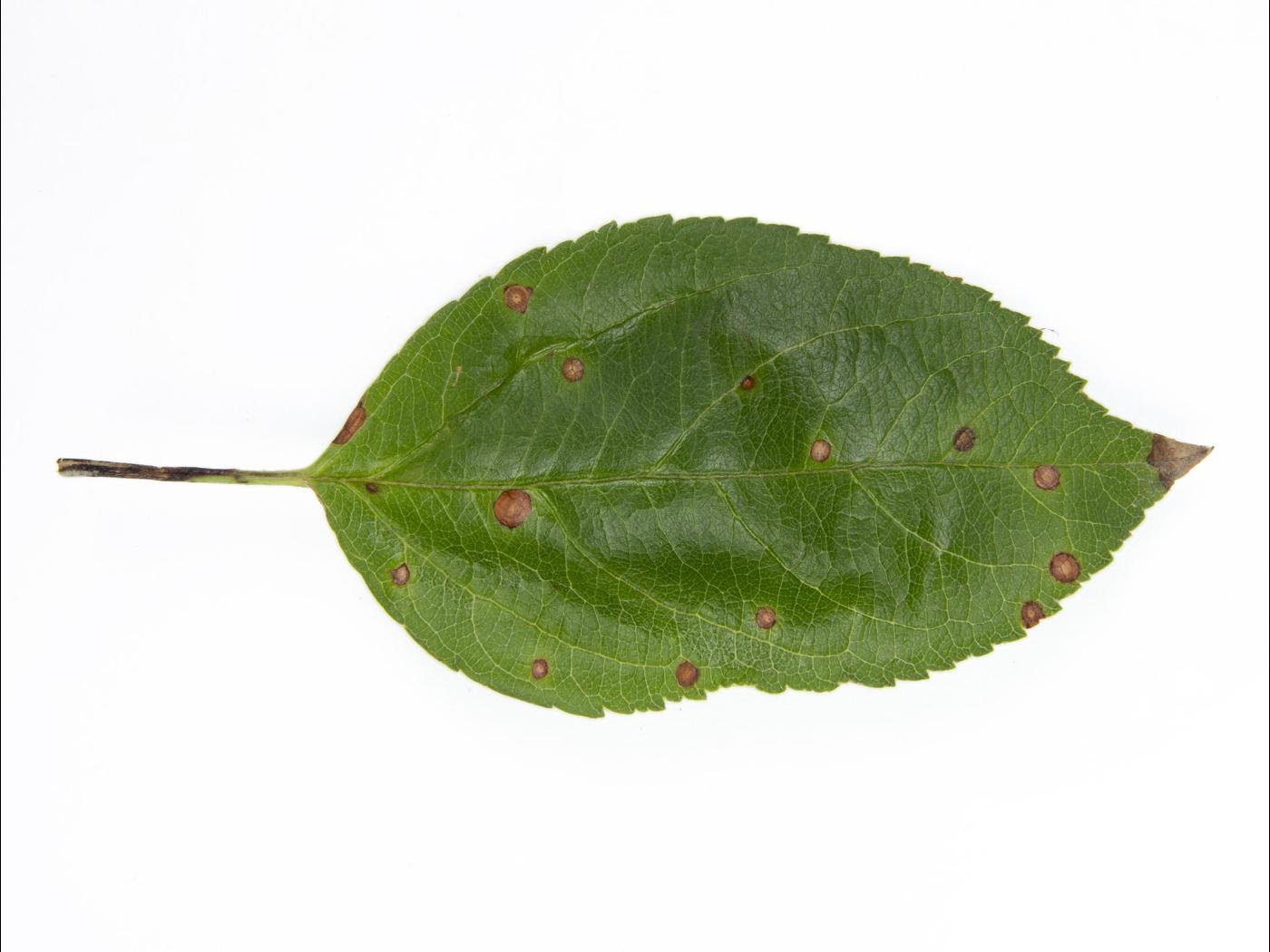 Description: Des taches d'apparence sèche ayant un pourtour brun violacé et un centre plus clair se développent sur le limbe. Les feuilles fortement touchées jaunissent et tombent.