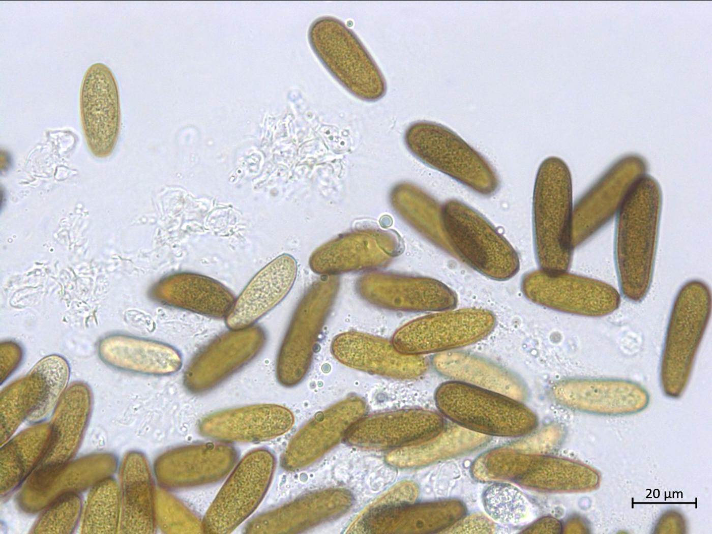 - Conidies : De teinte jaune à brune, allant vers un brun foncé en maturant. De forme oblongues à obclavées. Habituellement non-septées et peuvent avoir une septation en maturant. Dimensions : 30-45 x 10-16 μm.