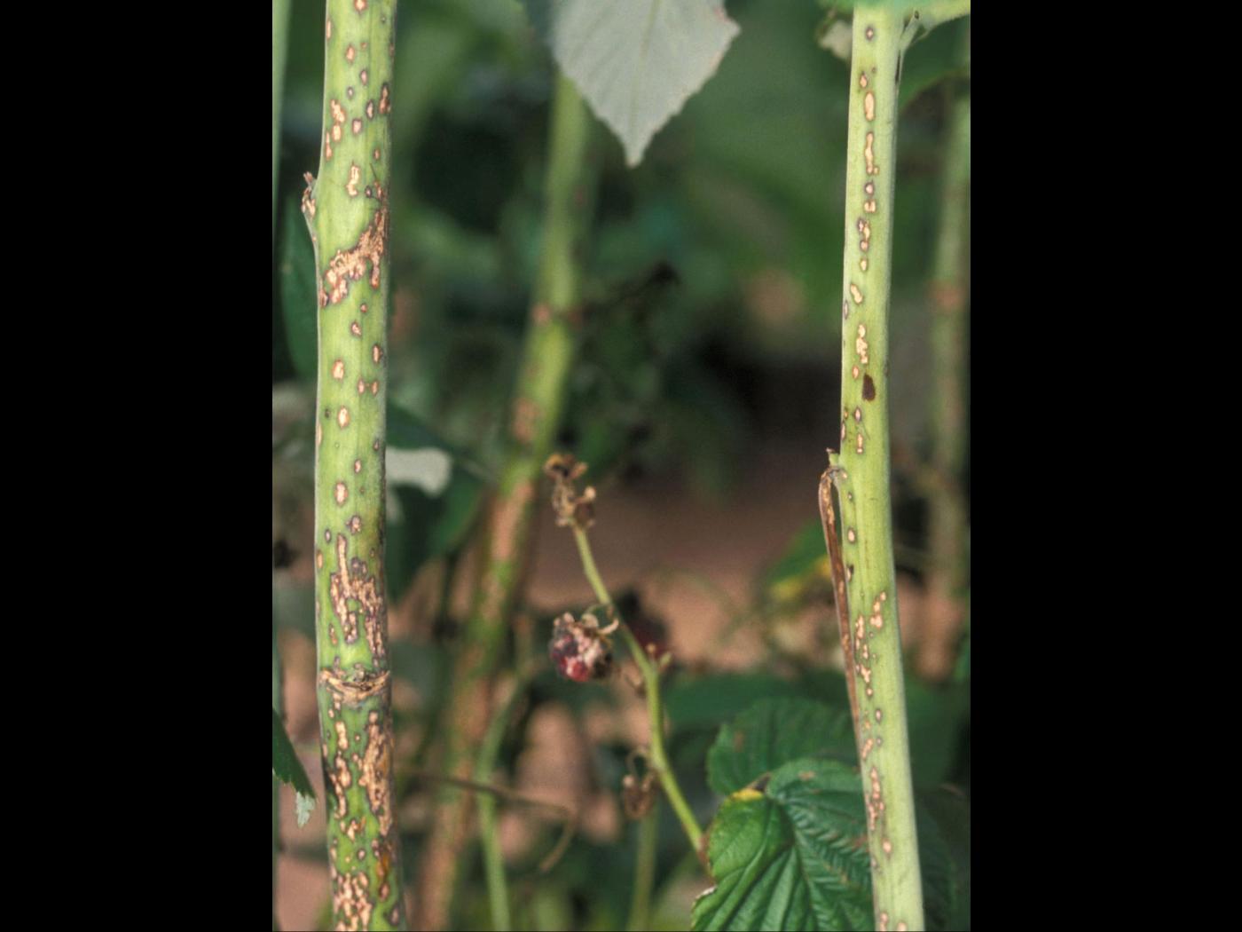 Tige : sur les jeunes tiges, présence de petites taches brunes, circulaires à elliptiques, avec un centre clair (blanchâtre à grisâtre) et une marge foncée. Les taches s’agglomèrent et deviennent grises, avec une étroite marge pourpre, déprimées, peuvent se fendre et encercler toute la tige. Dès l’automne, de petits points noirs (ascospores) sont formés sur les taches grises. L’encerclement de la tige et l’éclatement des taches réduisent le passage de la sève et des éléments nutritifs vers les fruits. Les tissus des tiges affectés se dessèchent et sont moins résistants aux conditions hivernales. Les symptômes sont localisés principalement au centre des tiges.