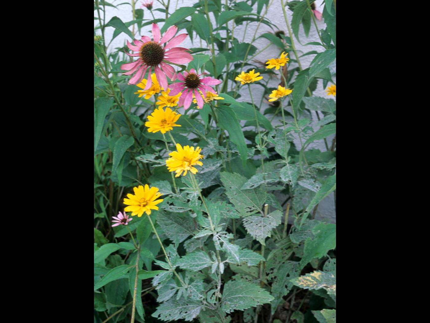 Description: À la face supérieure des feuilles d’héliopside cultivé au champ, présence de taches poudreuses blanchâtres recouvrant la totalité du limbe. L’examen à la loupe a permis de confirmer la présence du champignon Erysiphe sp., responsable du blanc (oïdium). Il s’agit probablement d’Erysiphe cichoracearum rapporté chez l’héliopside. Notez que les échinacées, à l'arrière-plan, sont également très sensibles au blanc.