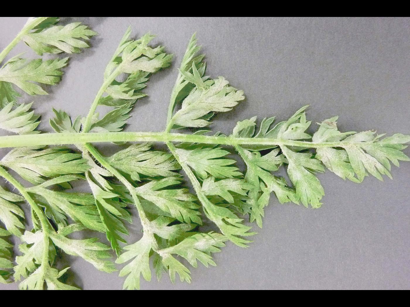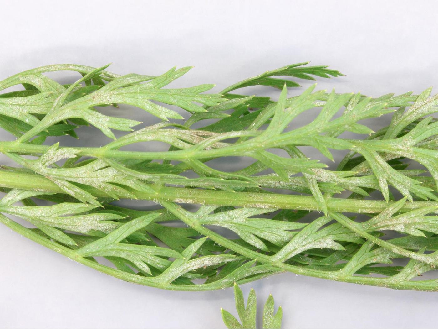 Feuille et pétiole : présence d’un duvet blanc de mycélium observé à la face supérieure et inférieure. Le duvet de mycélium couvre parfois presque toute la surface foliaire. Les vieilles feuilles sont les premières affectées. Parfois présence d’un jaunissement à brunissement du limbe, de taches ou de nécroses brunes à noires. Le blanc peut causer une défoliation précoce.