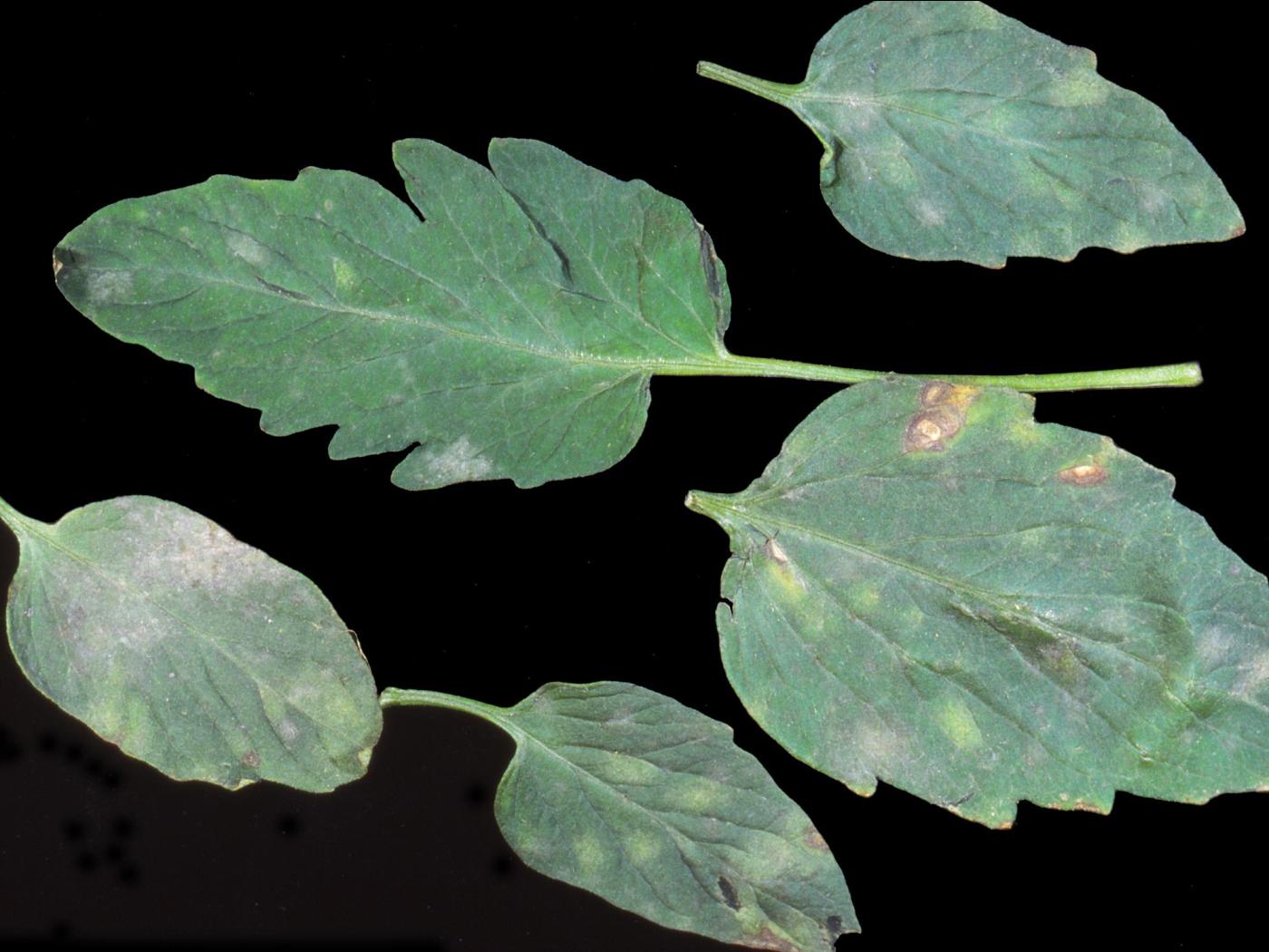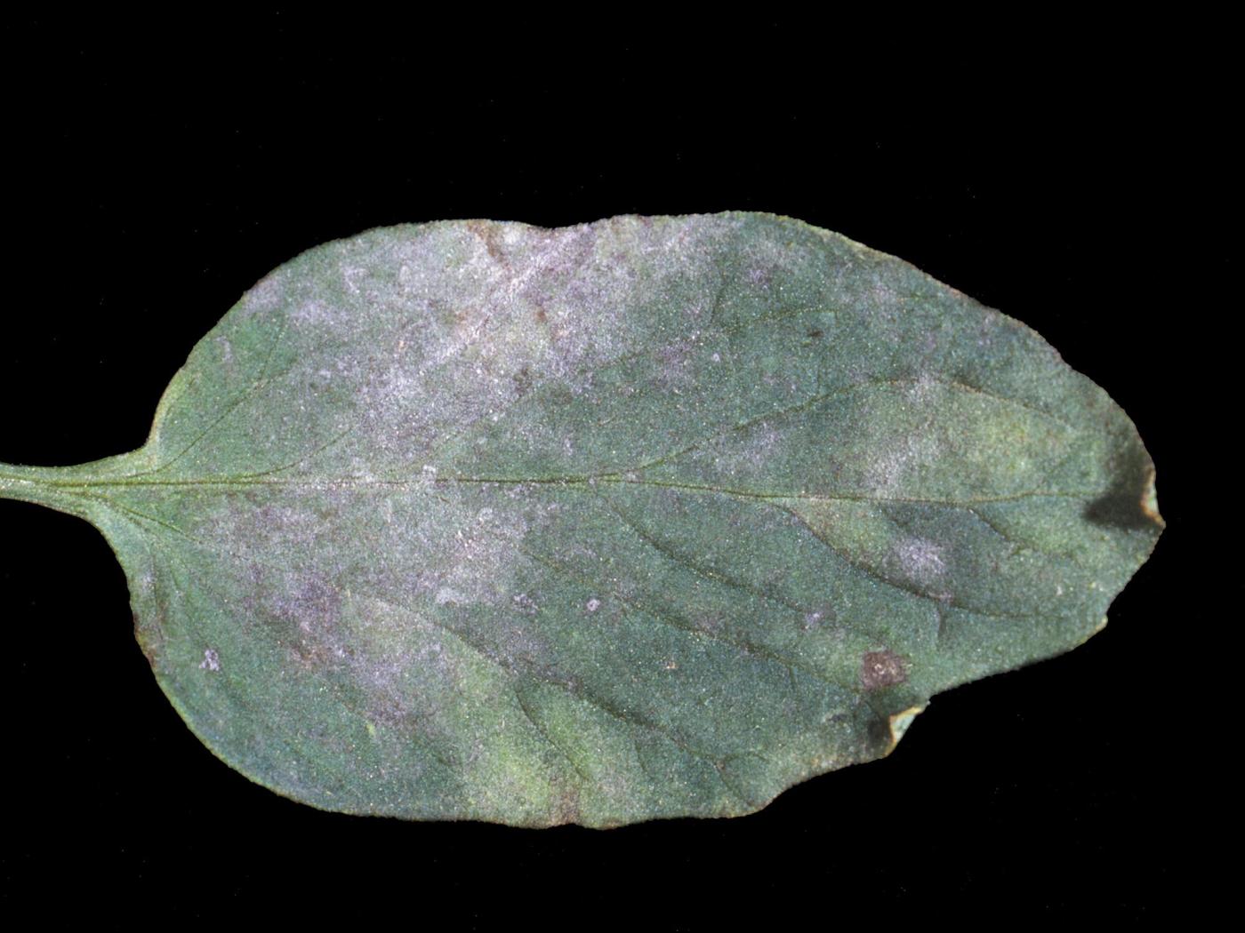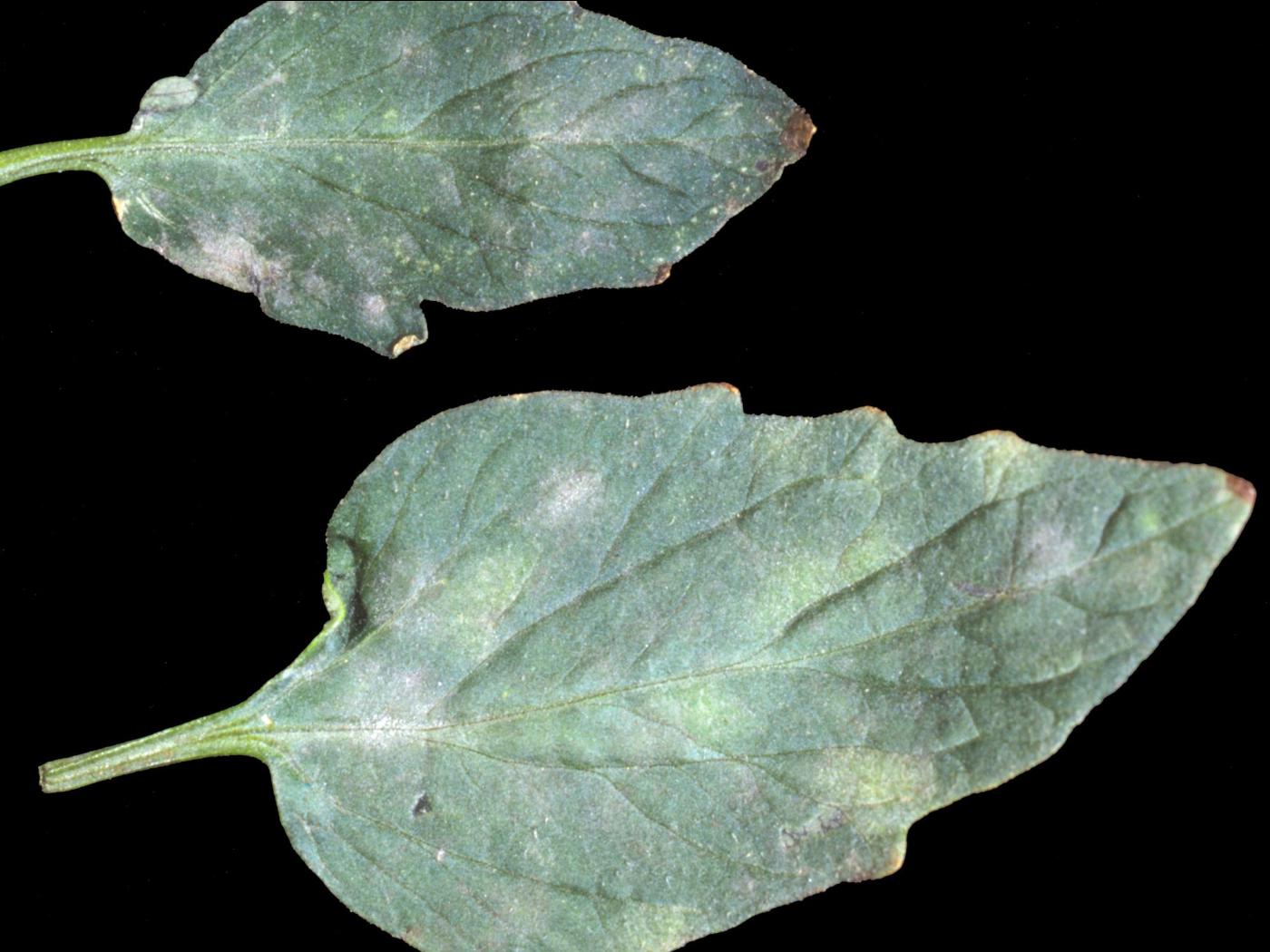 Feuille : à la face supérieure, présence de petites taches vert pâle à jaunes, d’une forme circulaire à angulaire, qui se couvrent d’un duvet blanc de mycélium et de conidies. Le duvet de mycélium tapisse parfois presque toute la surface foliaire. La sporulation peut être observée à la face inférieure. Les taches se manifestent en premier sur les vieilles feuilles puis progressent vers le haut du plant. Les feuilles infectées demeurent attachées à la tige.