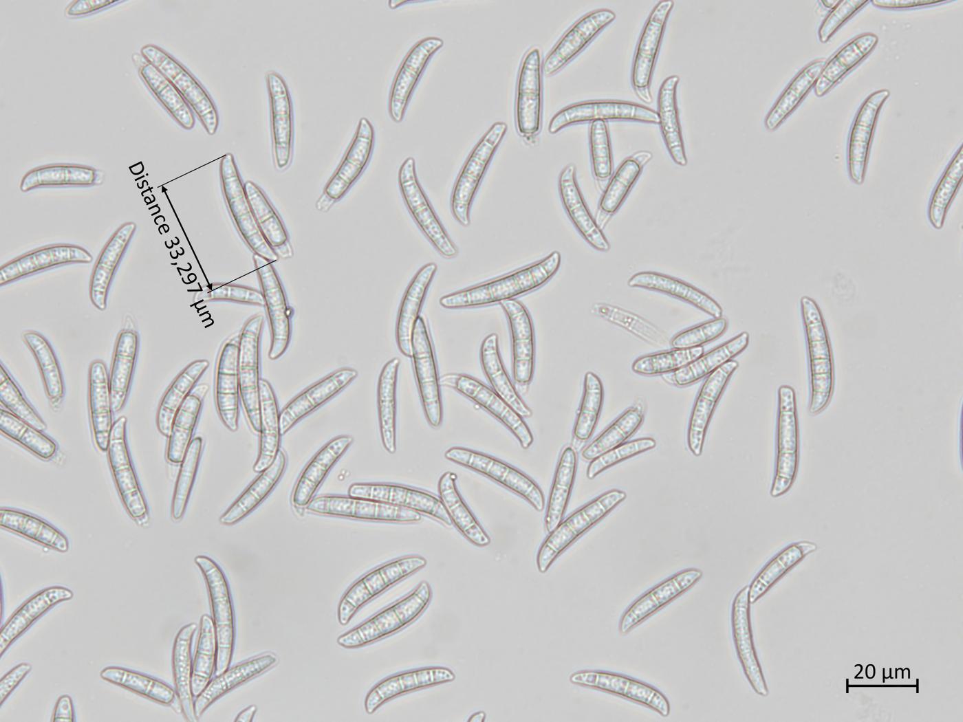 - Ascospores : Phragmospores à 3 septations transversales. Fusiformes à ellipsoïdes. Incurvées. Avec une légère constriction au niveau des septations. Dimension : 20-28 × 6-9 μm.