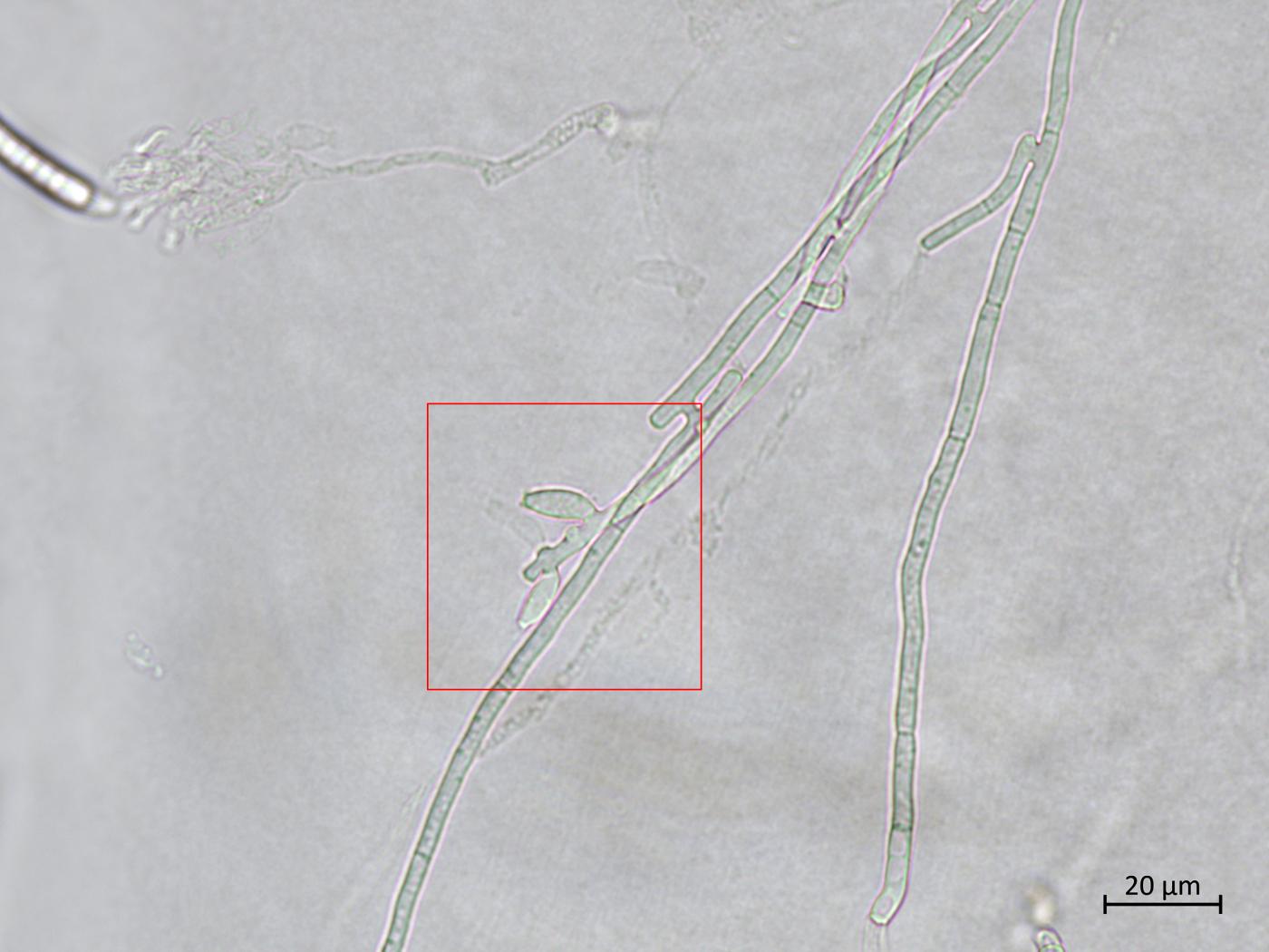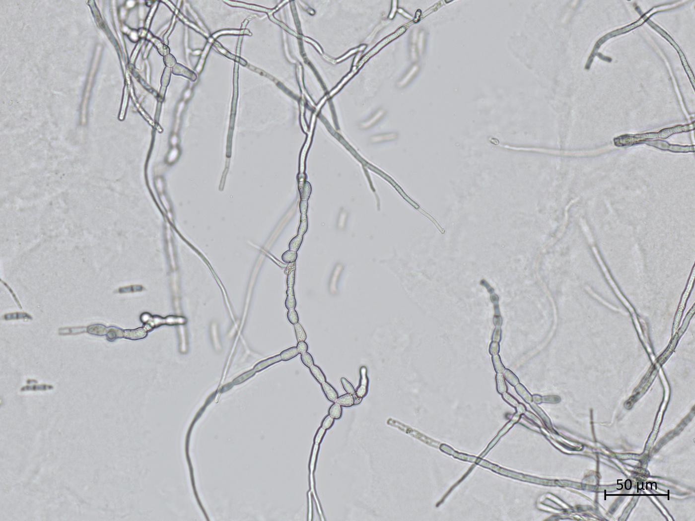 - Chlamydospores : Seules, en chaînes ou en grappes. Intercalaires ou terminales. Formées à partir des hyphes ou des macroconidies. Diamètre : 6-11 μm.