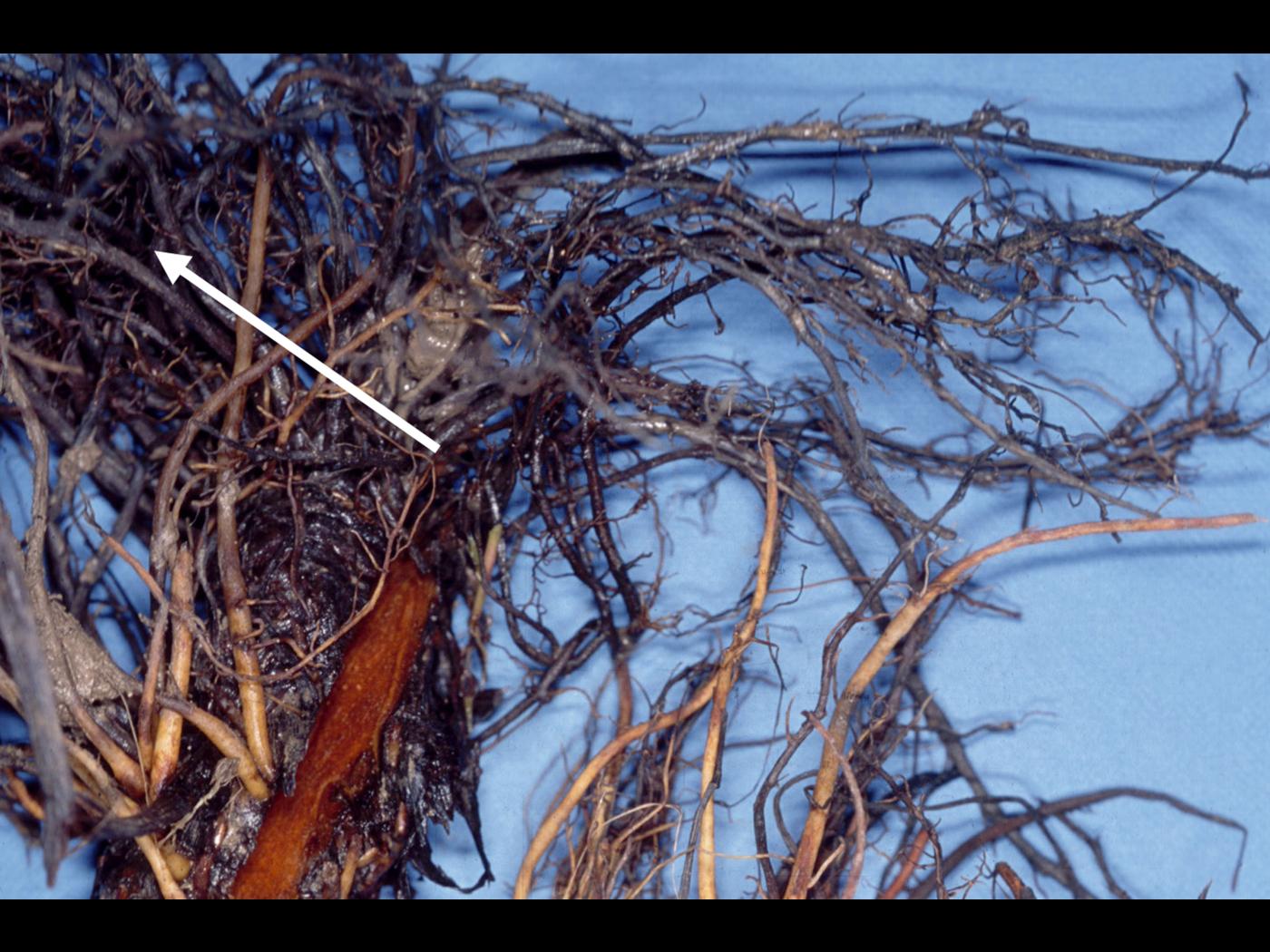 Racine : au début, développement de taches noires sur les racines blanches. Le système racinaire devient progressivement noir, l’intérieur de la racine est brun et les racines ne se développent plus. Le cortex se détache facilement mais la stèle demeure blanche. Absence, faible développement ou mortalité des radicelles.