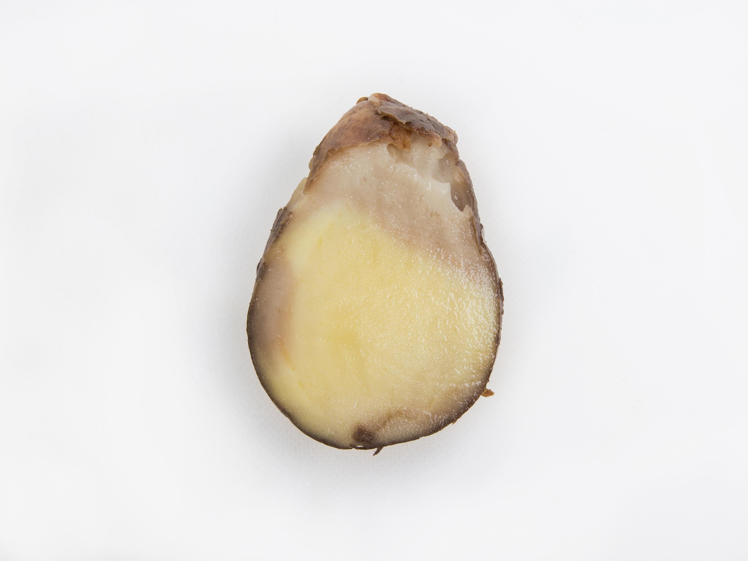 Légende: Brunissement et pourriture dans la chair d'un tubercule