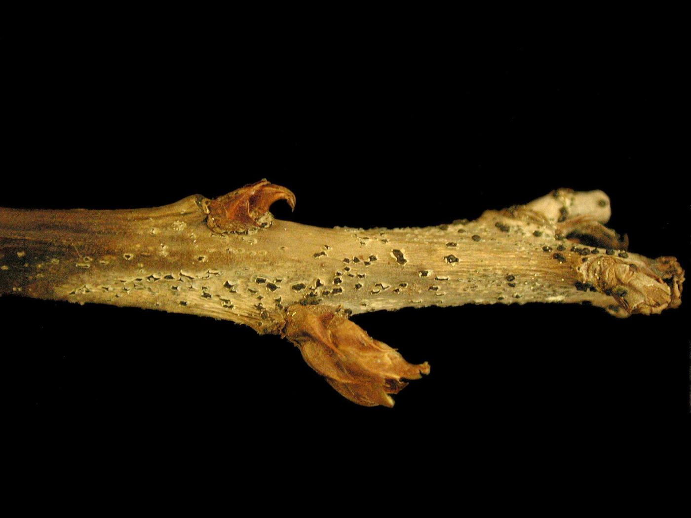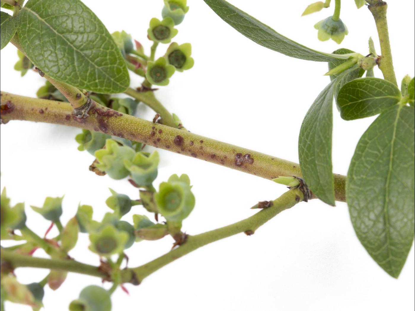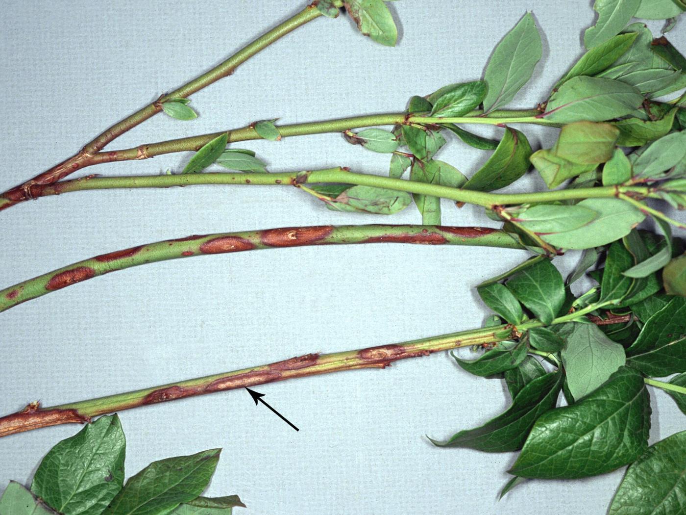 Tige : présence de taches rougeâtres localisées dans la partie basale des jeunes tiges de 1 à 2 années. Les taches entourent généralement les cicatrices foliaires. Ces taches évoluent en des chancres grisâtres entourés d’une large marge rougeâtre. En vieillissant, les chancres deviennent complètement gris et peuvent encercler la tige sur une longueur de 1 à 10 cm. La partie supérieure des tiges sèche et meurt. Généralement une à deux tiges meurent par plant, rarement tout le plant.