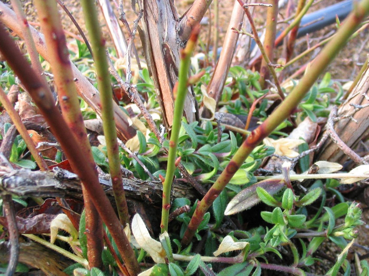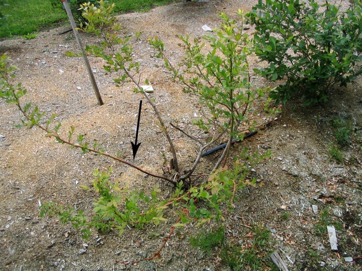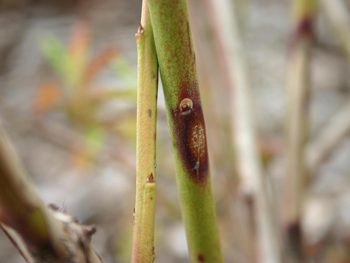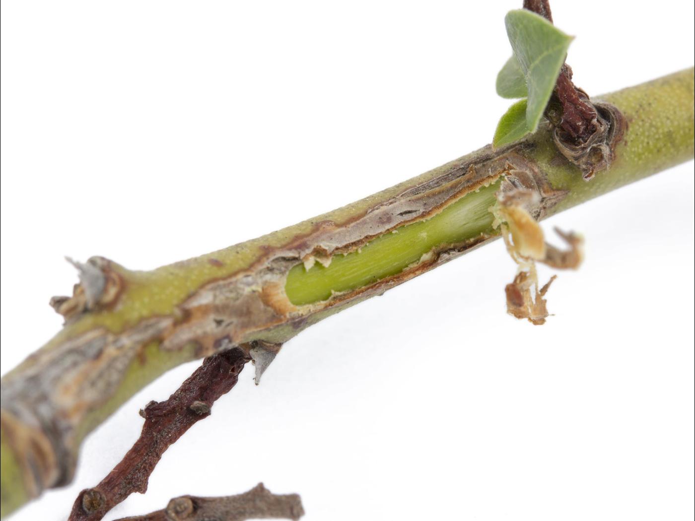 Tige : présence de taches rougeâtres localisées dans la partie basale des jeunes tiges de 1 à 2 années. Les taches entourent généralement les cicatrices foliaires. Ces taches évoluent en des chancres grisâtres entourés d’une large marge rougeâtre. En vieillissant, les chancres deviennent complètement gris et peuvent encercler la tige sur une longueur de 1 à 10 cm. La partie supérieure des tiges sèche et meurt. Généralement une à deux tiges meurent par plant, rarement tout le plant.