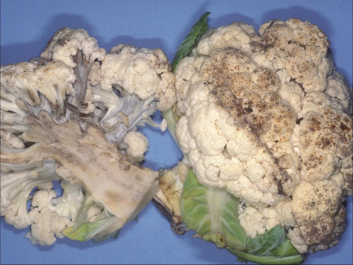 Fleur : présence d’une coloration brune à noire sur les inflorescences de brocoli et de chou-fleur. Les boutons floraux jaunissent et un mycélium apparait sur les tissus dégradés à la suite de l’entrée d’organismes secondaires. Dans la partie supérieure des inflorescences, présence d’un brunissement à noircissement du système vasculaire et/ou de la moelle. Présence potentielle de sporulation fongique et de pourriture.
