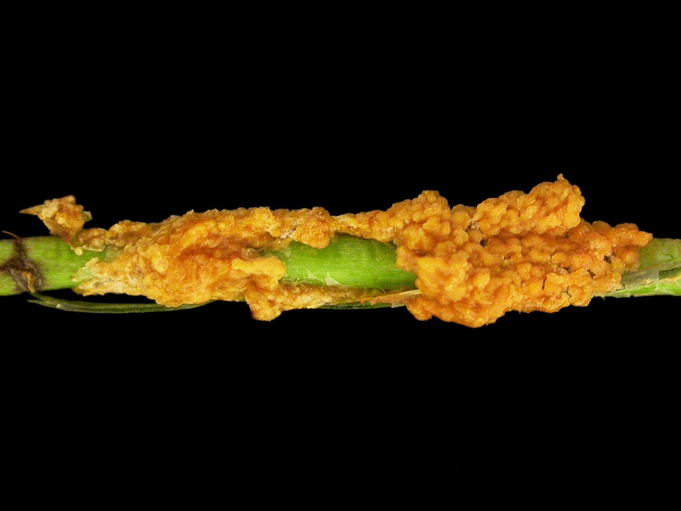 Les myxomycètes survivent d’une saison à l’autre grâce à des spores qui sont très résistantes à la dessiccation (sclérotes). Entre la fin du printemps et l’automne, les spores germent sous des conditions fraîches et humides et produisent des myxamibes ou des myxoflagellés. Ces structures formeront des plasmodes gélatineux capables de se déplacer près de la surface du sol. Lorsque la température devient chaude et humide, les plasmodes montent à la surface du sol et se développent sur la végétation basse pour se nourrir. Ils ressemblent alors à des masses visqueuses d’œufs blancs. Plus tard, les plasmodes se transforment en masses globuleuses (sporanges) à la surface dure et sèche, qui produisent une grande quantité de spores. Normalement, les sporanges sont la seule étape du cycle de la maladie réellement visible sur les plantes. Les spores sont facilement dispersées par le vent, l’eau, l’équipement, les gens et les animaux.