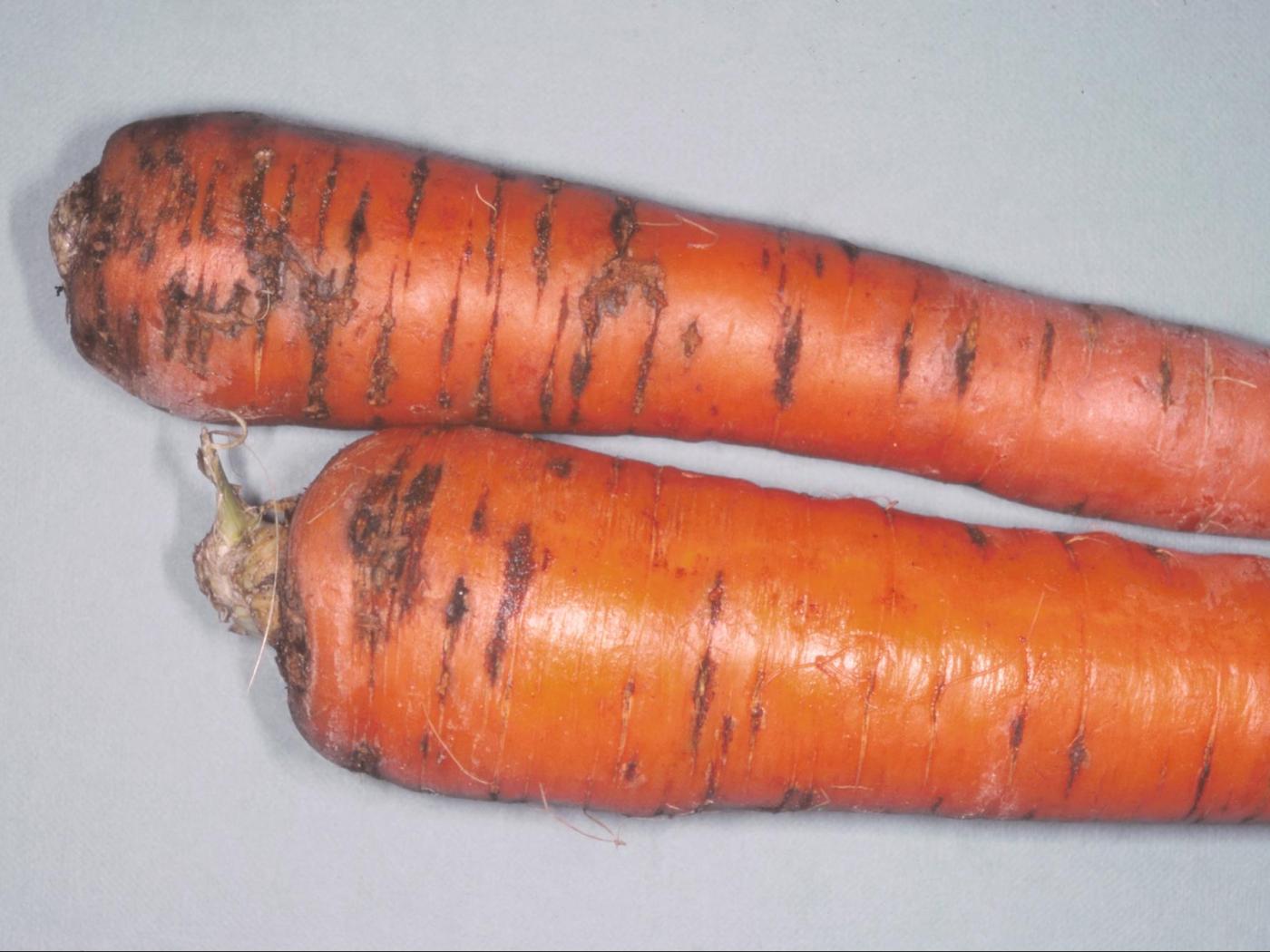 Description: Sur des carottes provenant d’un champ, présence de lésions brunes à noires, horizontales et suivant les lenticelles, situées majoritairement dans la partie supérieure de la racine. Les lésions sont sèches et superficielles. Les tests de laboratoire ont révélé la présence du champignon Fusarium solani, responsable de la pourriture sèche fusarienne.