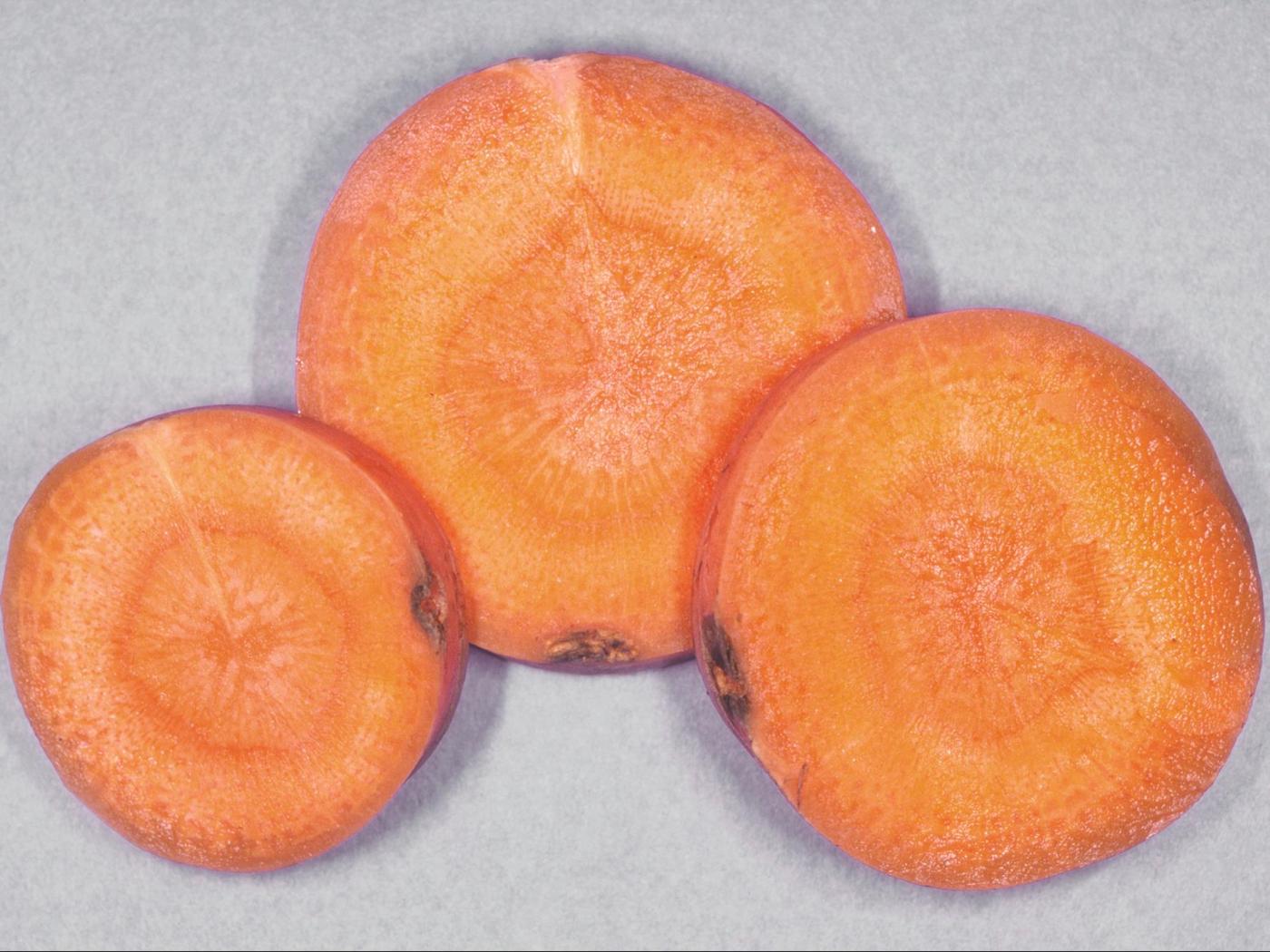 Description: Sur des rondelles de carotte provenant d’un champ, on remarque que les dommages ne pénètrent pas profondément dans la chair. Sur l’épiderme, il y avait de petites lésions noires, horizontales et d’aspect sec. Les tests de laboratoire ont révélé la présence du champignon Fusarium solani, responsable de la pourriture sèche fusarienne.