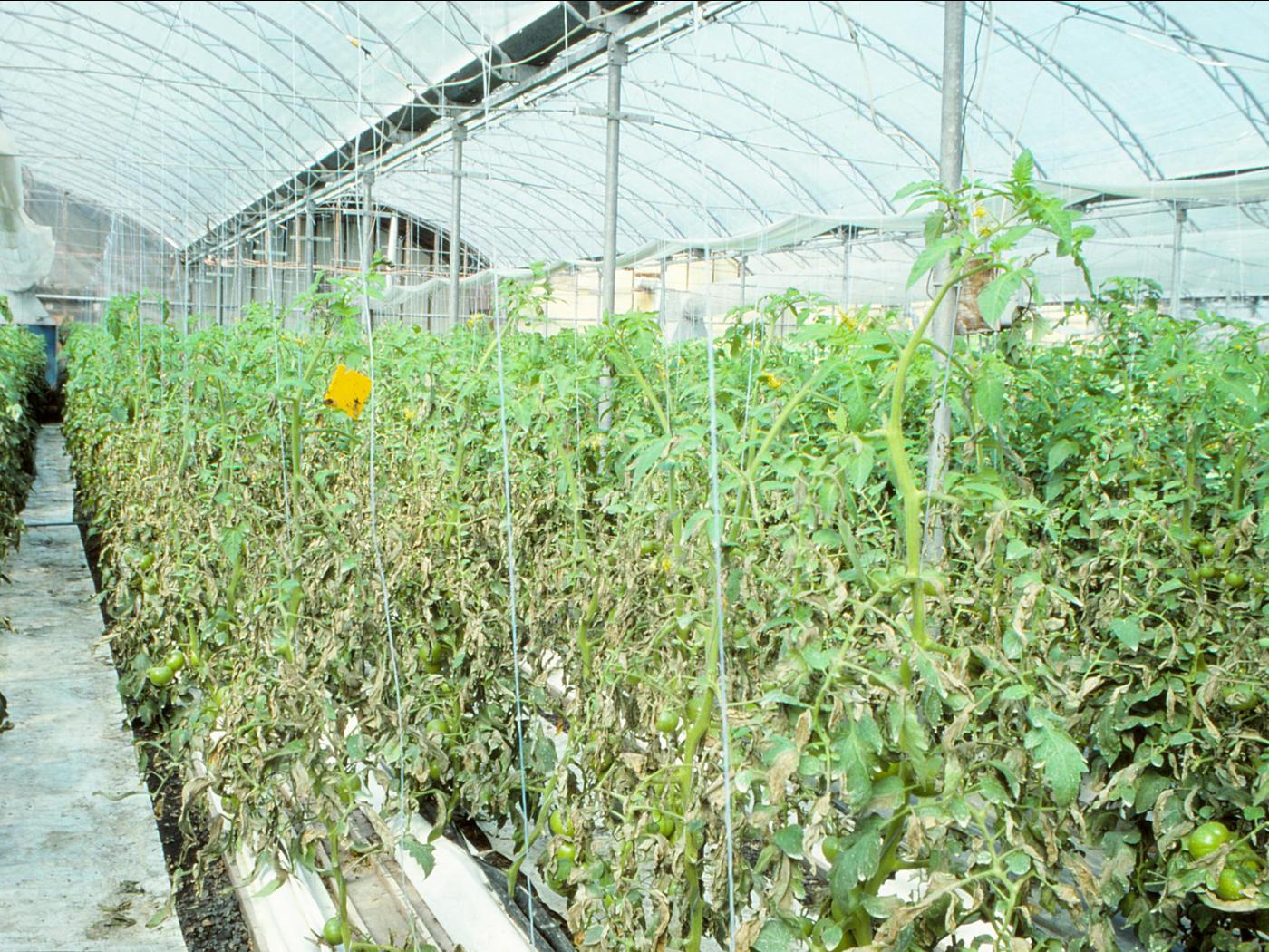 Le mildiou, causé par Phytophthora infestans, est un parasite susceptible de s'attaquer à tous les organes aériens de la plante. C’est une maladie commune et extrêmement destructive de la tomate. Le mildiou affecte davantage la tomate de champ que celle cultivée en serre sauf si les conditions serricoles sont fraîches et humides. Phytophthora infestans affecte également la pomme de terre, le poivron, l’aubergine, le pétunia et des mauvaises herbes des solanacées (surtout les morelles (Solanum spp.)). Au champ, la tomate est infectée si elle est cultivée près des champs de pommes de terre attaquées par le mildiou. En serre, l’inoculum provient des champs de pommes de terre infectés des environs. Le mildiou évolue rapidement si les conditions sont humides et que la maladie n’est pas contrôlée. Les cultures peuvent être détruites en quelques jours. Une fois établie, la lutte à Phytophthora est ardue, voire impossible. Les plants affectés sont distribués en foyers.