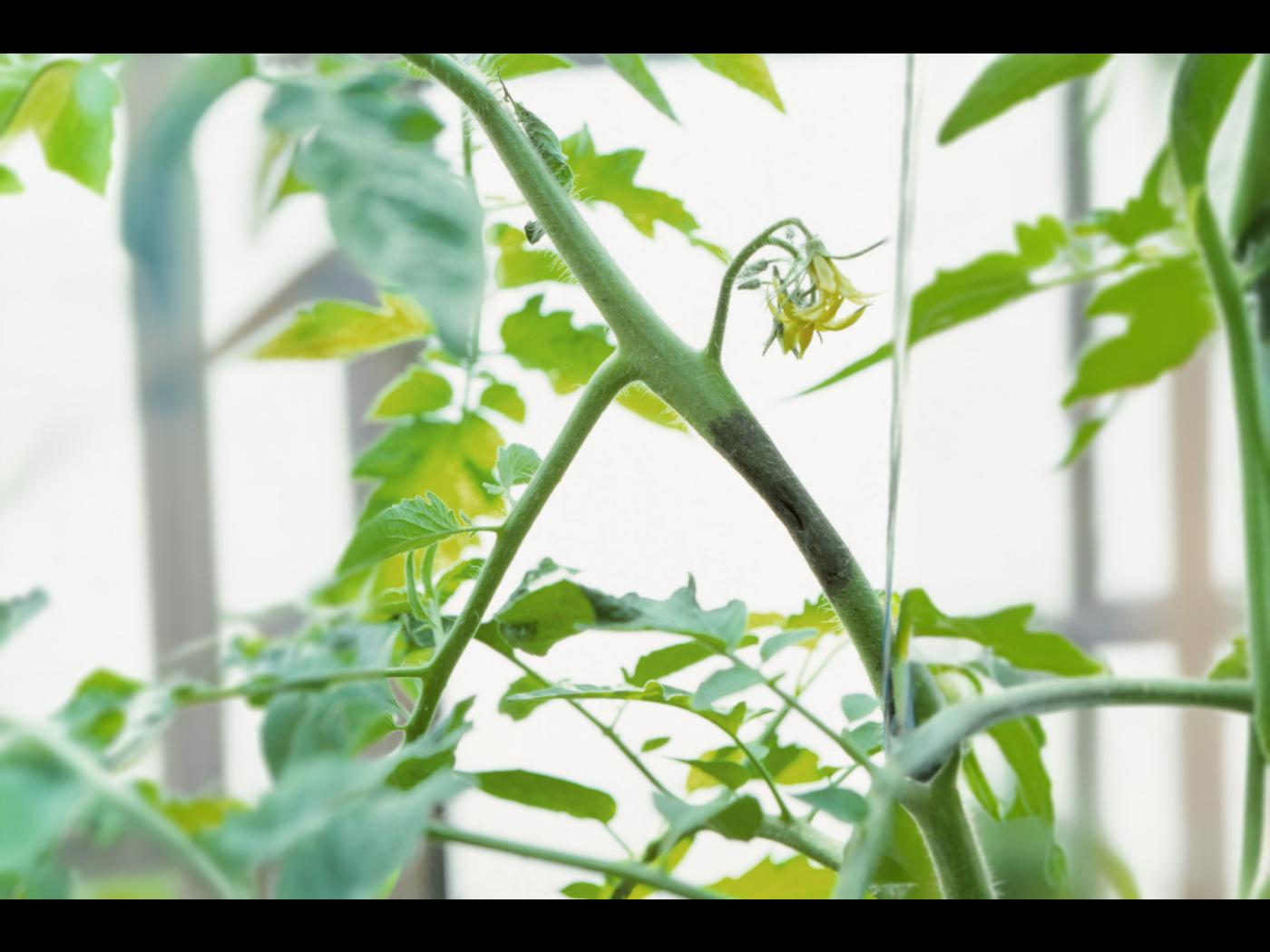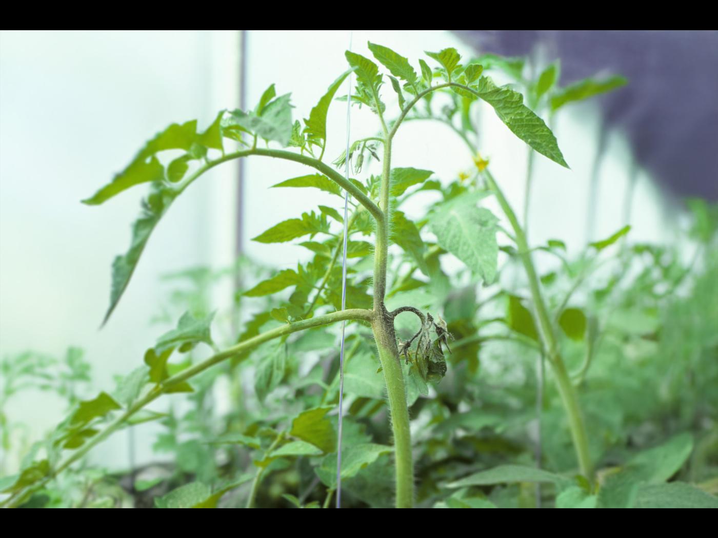 Tige : présence de taches irrégulières, brun foncé à noires, débutant à la zone d’attache du pétiole des feuilles sur la tige ou à l’apex de la tige. Sous des conditions humides, présence de mycélium. Les taches prennent rapidement de l’expansion et évoluent en des chancres pouvant couvrir ou encercler toute la tige. Les tiges infectées sont fragiles, cassent facilement et peuvent mourir.