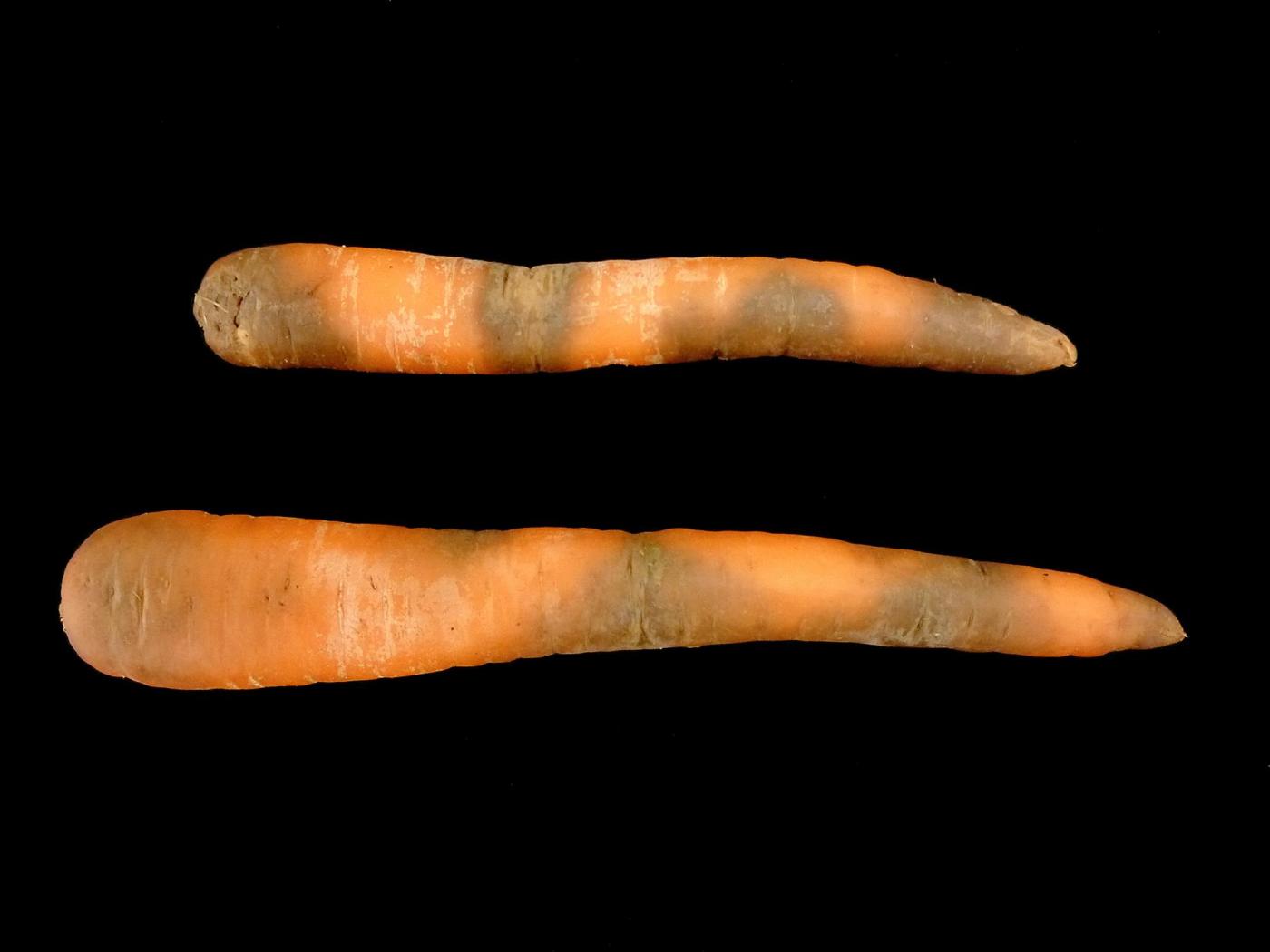 Description: Sur des carottes provenant d’un entrepôt, présence d’un brunissement près du collet, à l’apex et à divers endroits sur la racine. La racine est molle, mais non pourrie et d’aspect caoutchouteux. La chair est brune vis-à-vis le brunissement externe (non visible ici). Les tests de laboratoire ont révélé la présence de Phytophthora sp., responsable de la pourriture brune caoutchouc.