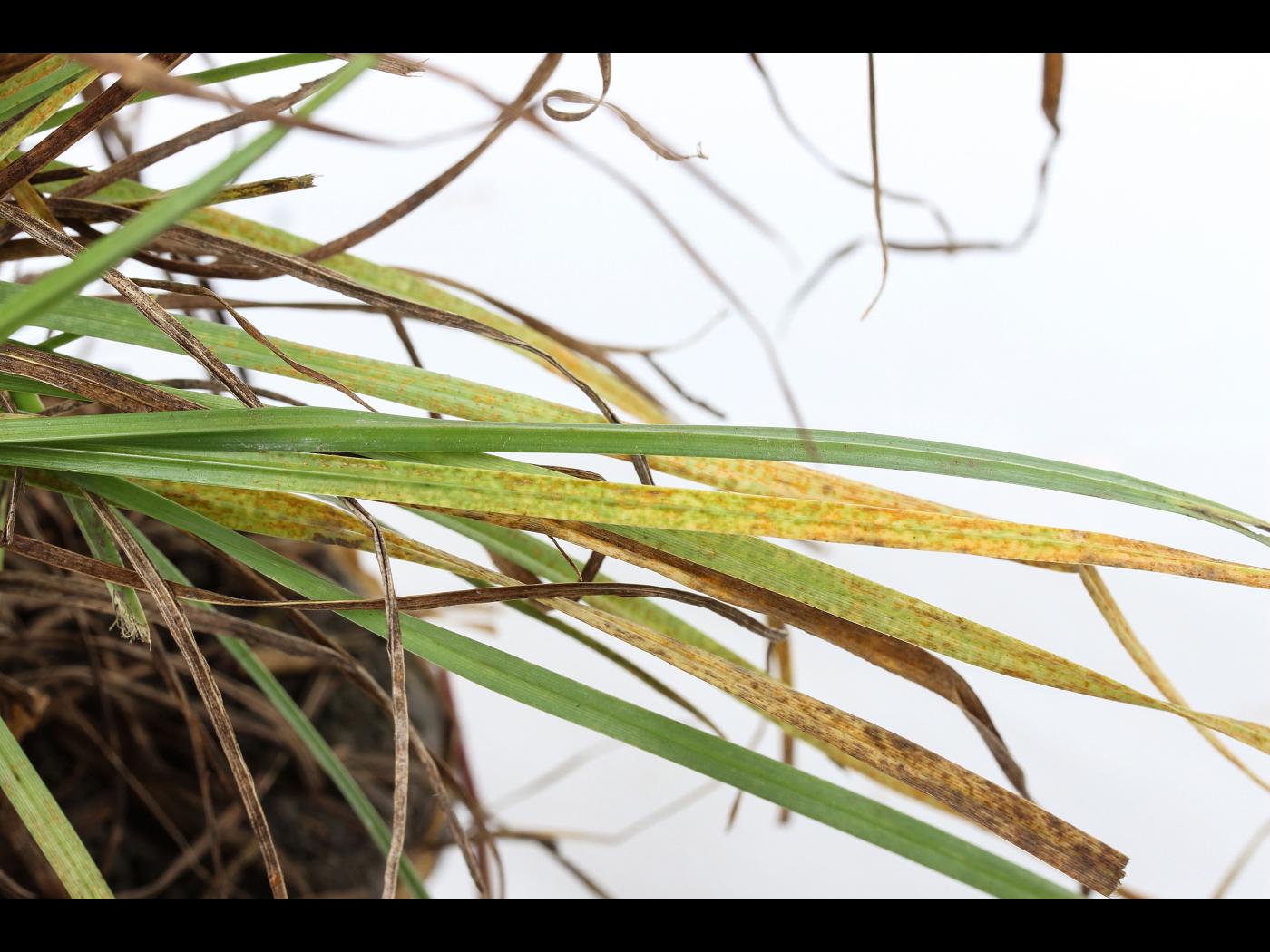Feuille et tige : au début, présence d’une moucheture ou de petites taches jaune pâle. Ces taches élargissent, s’allongent et se développent parallèlement aux nervures. Lorsque les lésions sont matures, des pustules (urédies) de différentes couleurs (jaune, orange, rouge, brun, etc.) font irruption au travers de l’épiderme. Elles sont observées à la face supérieure et/ou inférieure des feuilles. Les pustules matures finissent par se rompre et libèrent des spores (urédospores). Lorsque des téliospores (spores de survie) sont produites, les urédies deviennent noires (télies). Vu de loin, le gazon paraît jaune puis roux.