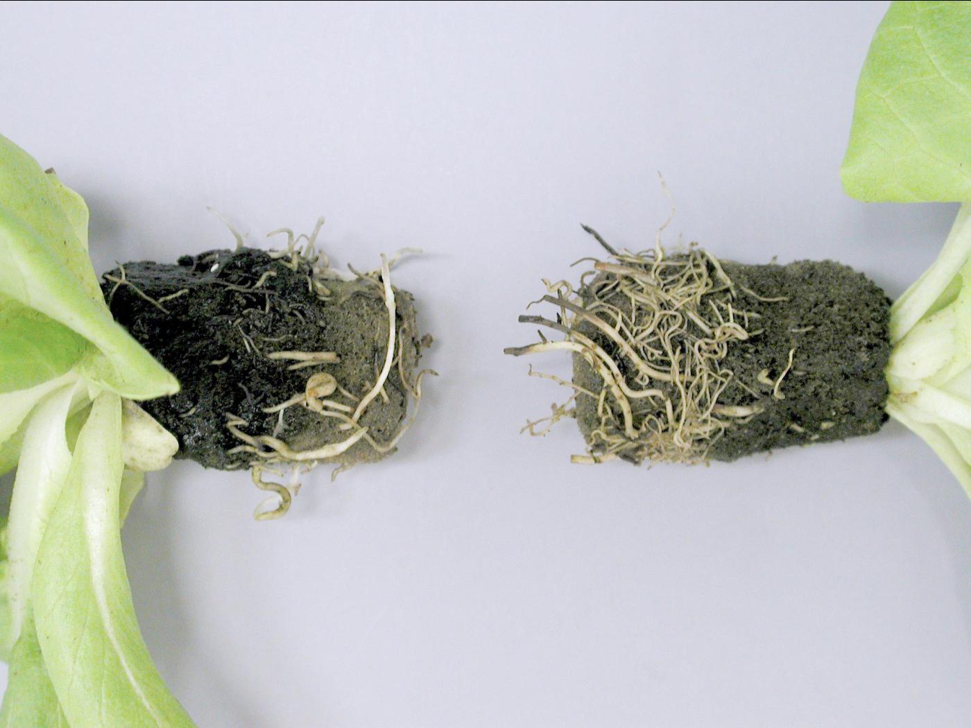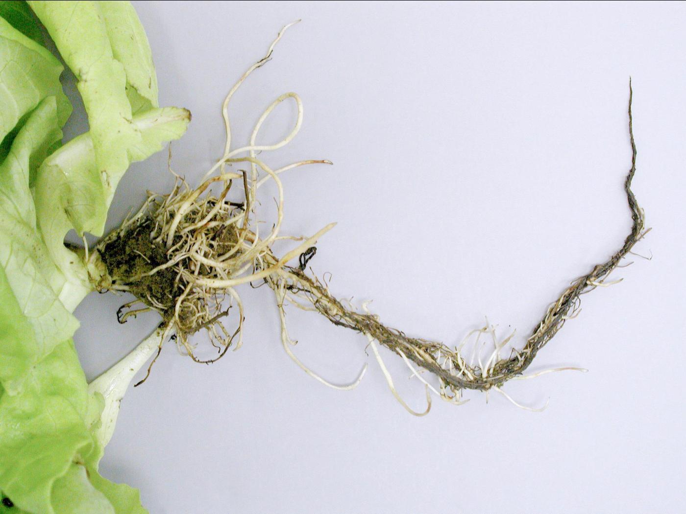 La laitue cultivée en culture hydroponique est particulièrement sensible à Pythium et à un degré moindre, aux Phytophthora spp. Les principales maladies sont la fonte des semis et la pourriture des racines (pourridié pythien) sur les plantes plus développées. La pourriture des racines se développe surtout sur les plants stressés et elle affecte essentiellement les radicelles. Pythium dissotocum et P. aphanidermatum sont communément rapportés chez la laitue hydroponique, le basilic, l’épinard et le haricot. Pythium dissotocum se manifeste lorsque la température du sol varie entre 17 et 22 °C tandis que P. aphanidermatum préfère des températures supérieures à 23 °C. Les plants affectés sont distribués en foyer ou de manière éparse. Il n’existe aucune variété de laitue résistante.