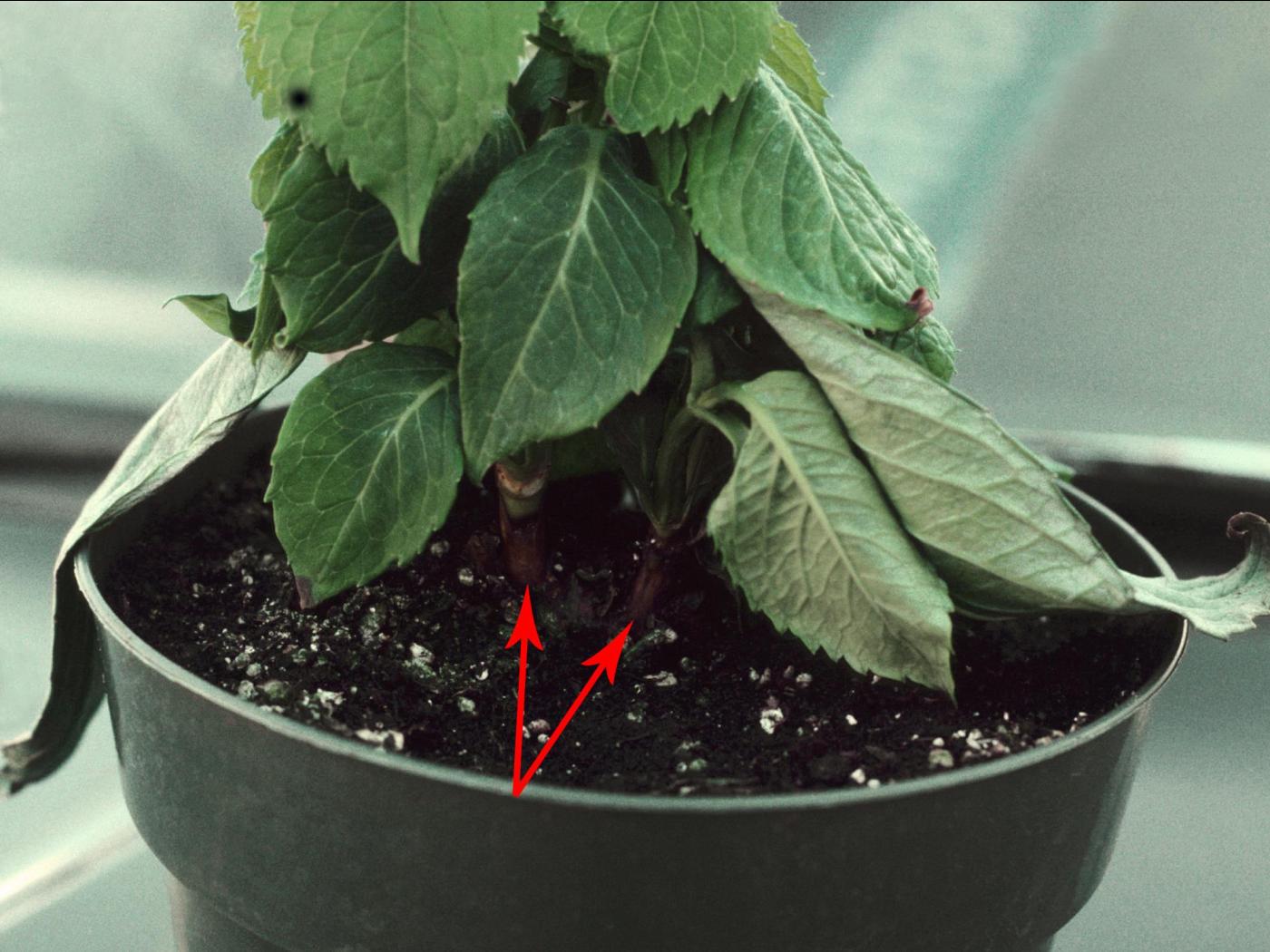 Collet : présence de taches ou de lésions déprimées, profondes, rouges à brun foncé à noires au collet et/ou dans la partie supérieure de la racine. Les plants matures montreront des chancres rougeâtres à brunâtres.