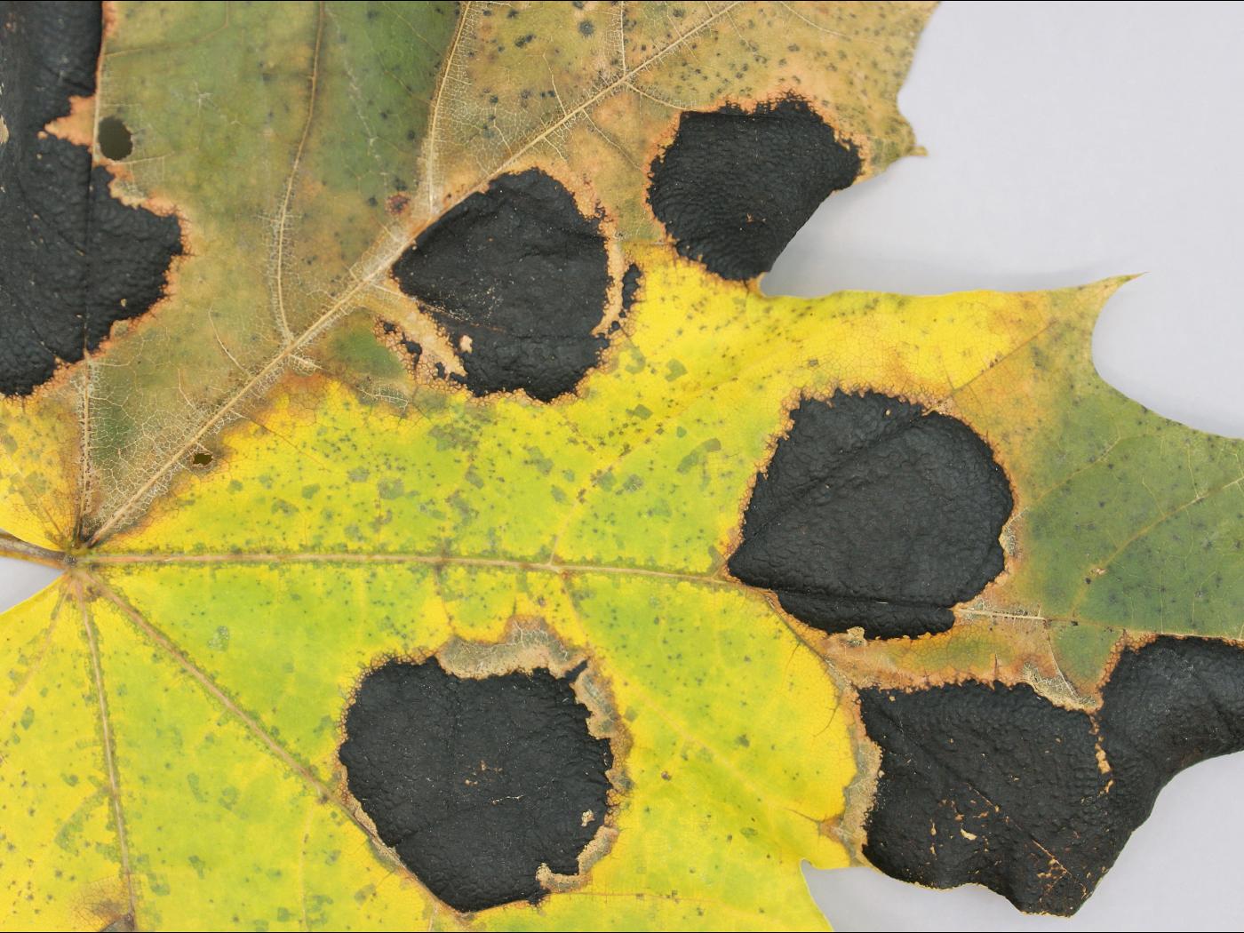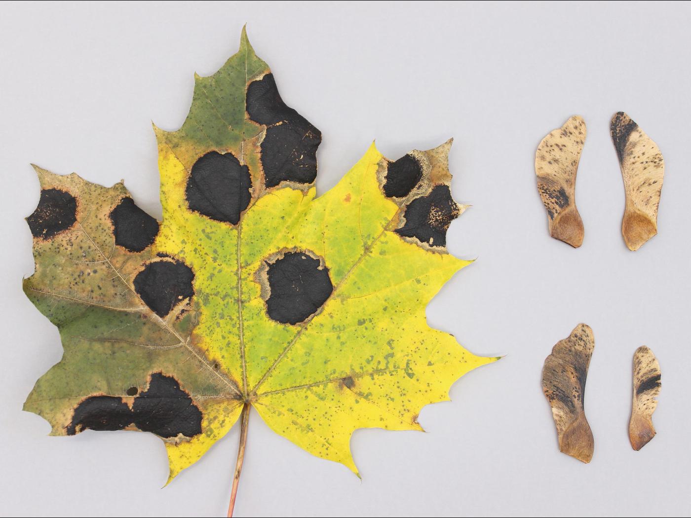 Description: Une feuille d’érable de Norvège montre de grandes taches noires plutôt circulaires et d’aspect goudronneux. Sur les samares, les taches sont beaucoup plus petites. Chez l’érable de Norvège, ce symptôme est caractéristique de la tache goudronneuse causée par le champignon Rhytisma acerinum.