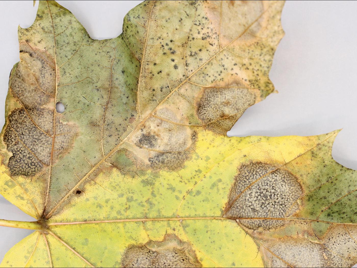 Légende: Taches à la face inférieure d'une feuille d'érable de Norvège