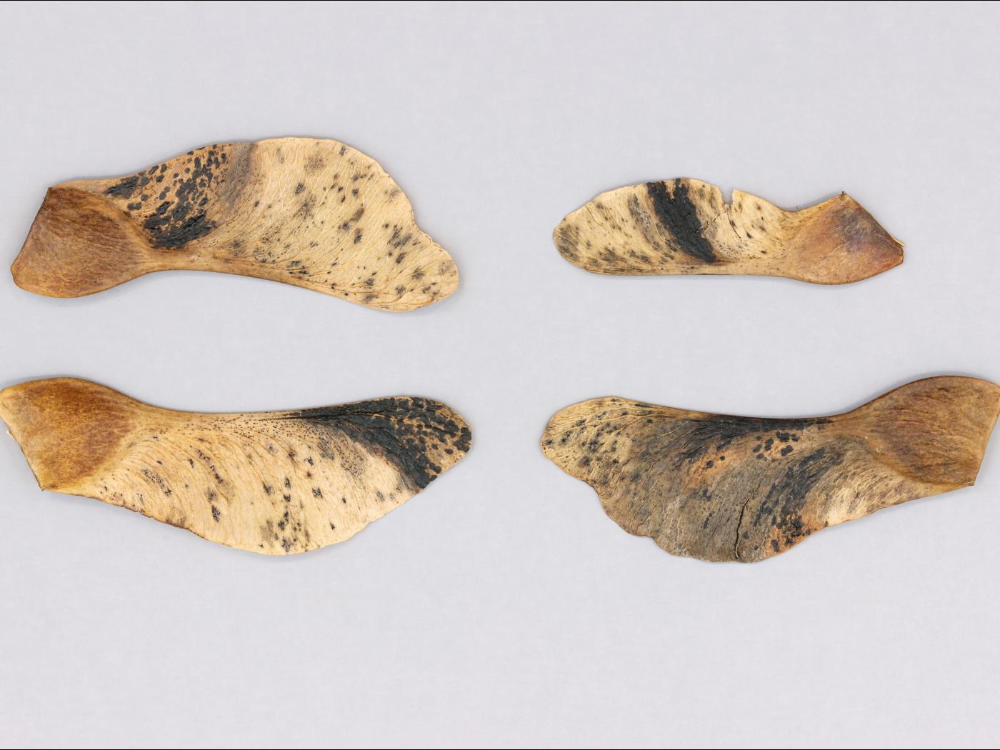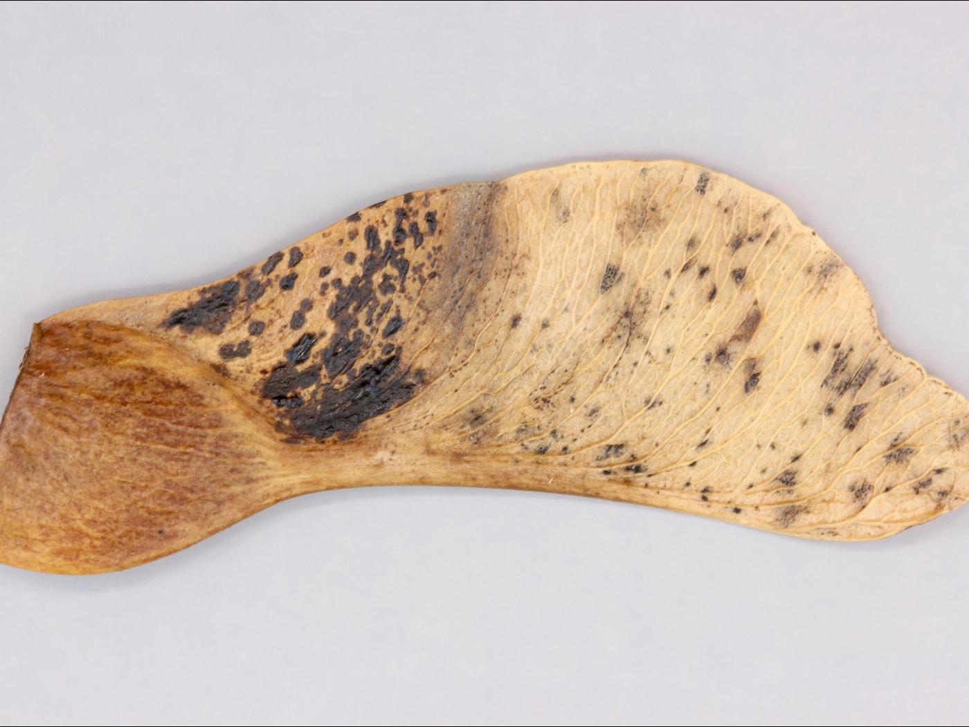 Description: Une samare provenant d’un érable de Norvège montre de petites taches noires plutôt circulaires. Chez l’érable de Norvège, ce symptôme est caractéristique de la tache goudronneuse causée par le champignon Rhytisma acerinum.