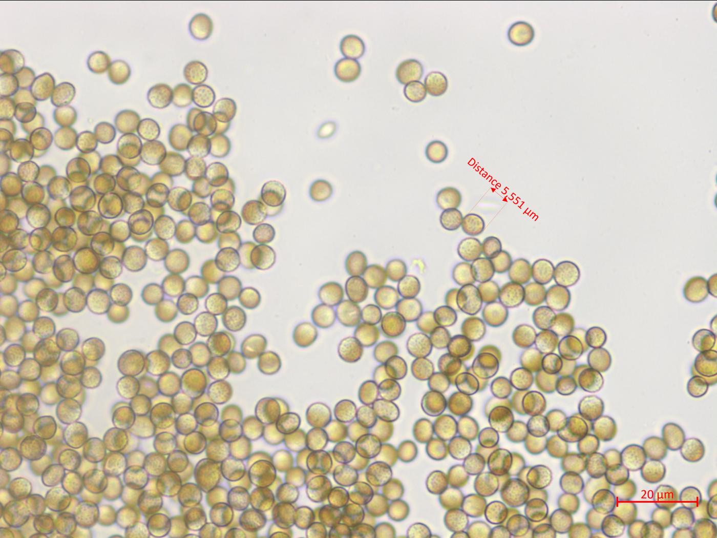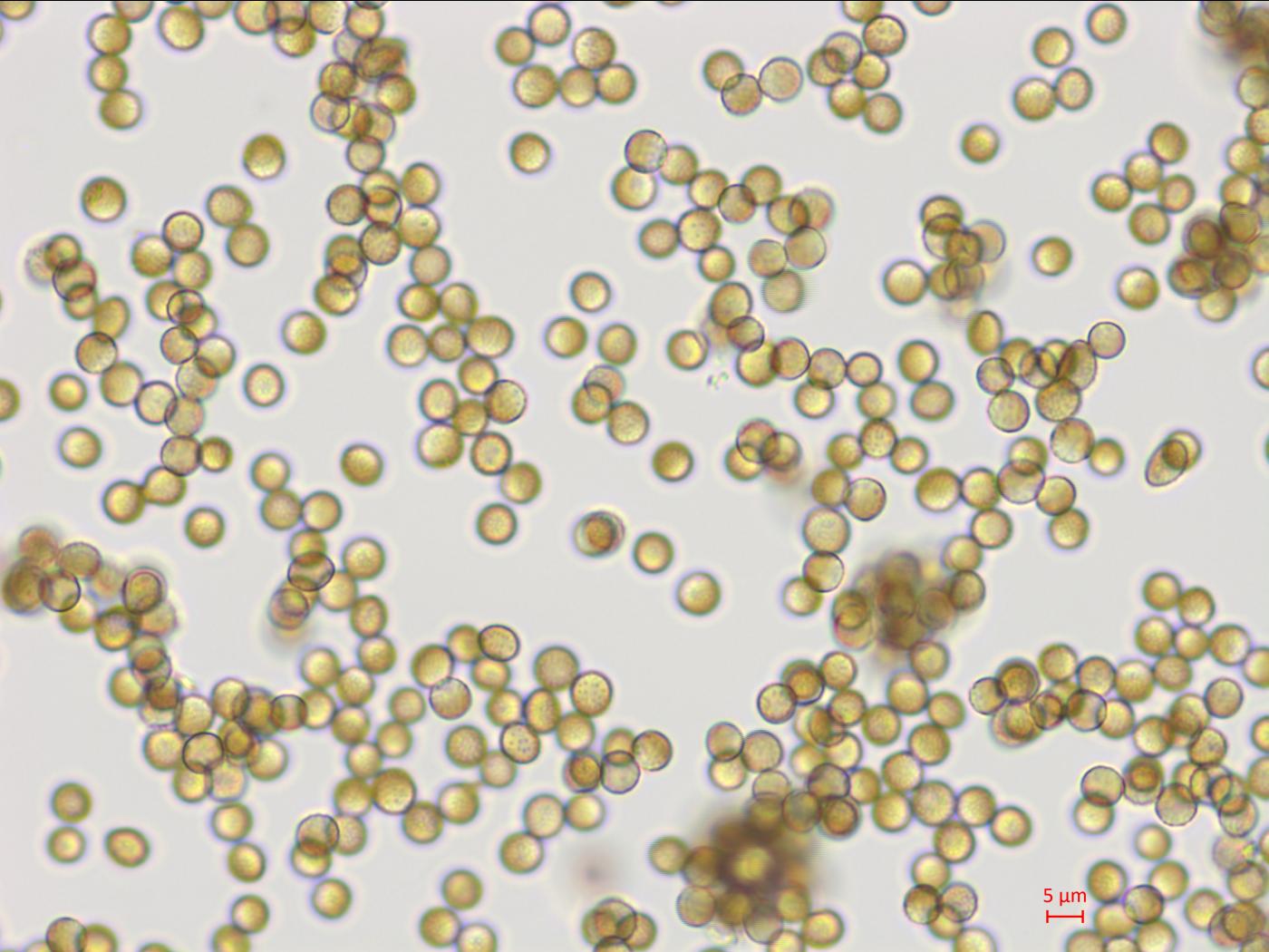 • Téliospores : Globuleuses ou parfois irrégulières. Brun jaune pâle. Finement échinulées. Diamètre : 5-9 µm.