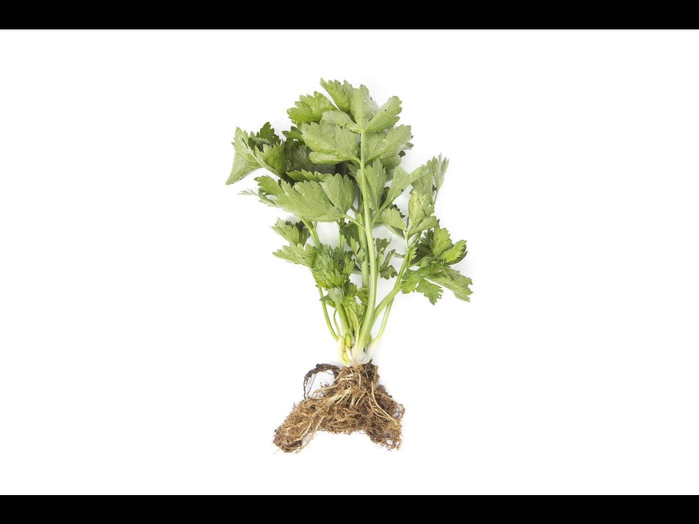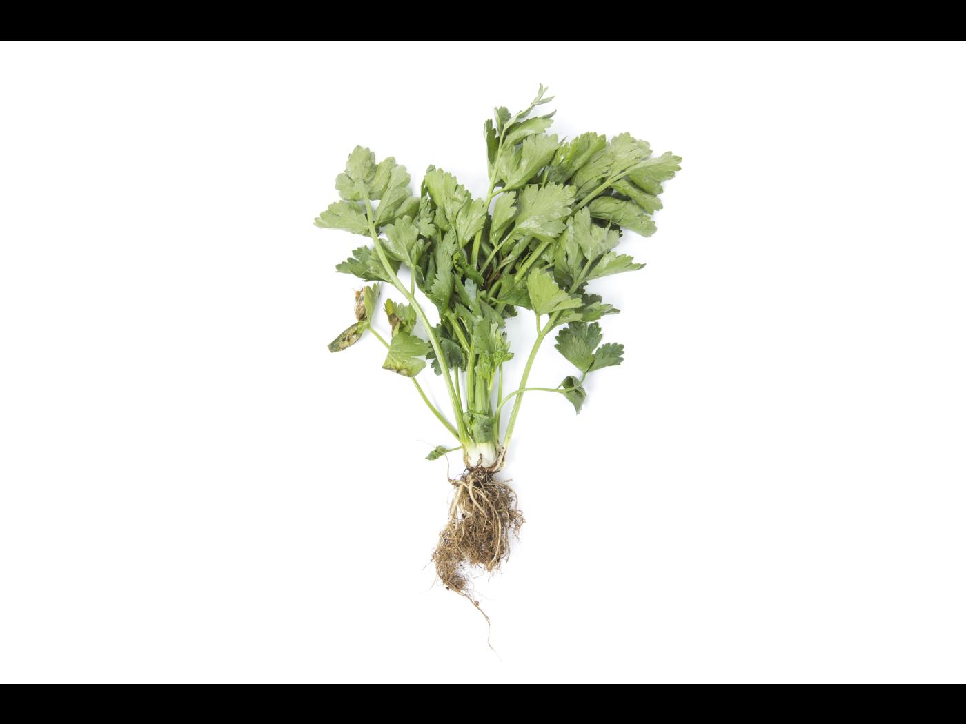 Description: Un plant de céleri montre un jaunissement localisé de certaines feuilles basales. Les racines portent de multiples petits renflements beiges (peu visible ici). Les observations microscopiques ont révélé la présence du nématode Meloidogyne sp. Il s’agit probablement de M. hapla. Ce nématode est responsable de la nodosité des racines. Les plants sont cultivés dans un sol organique.