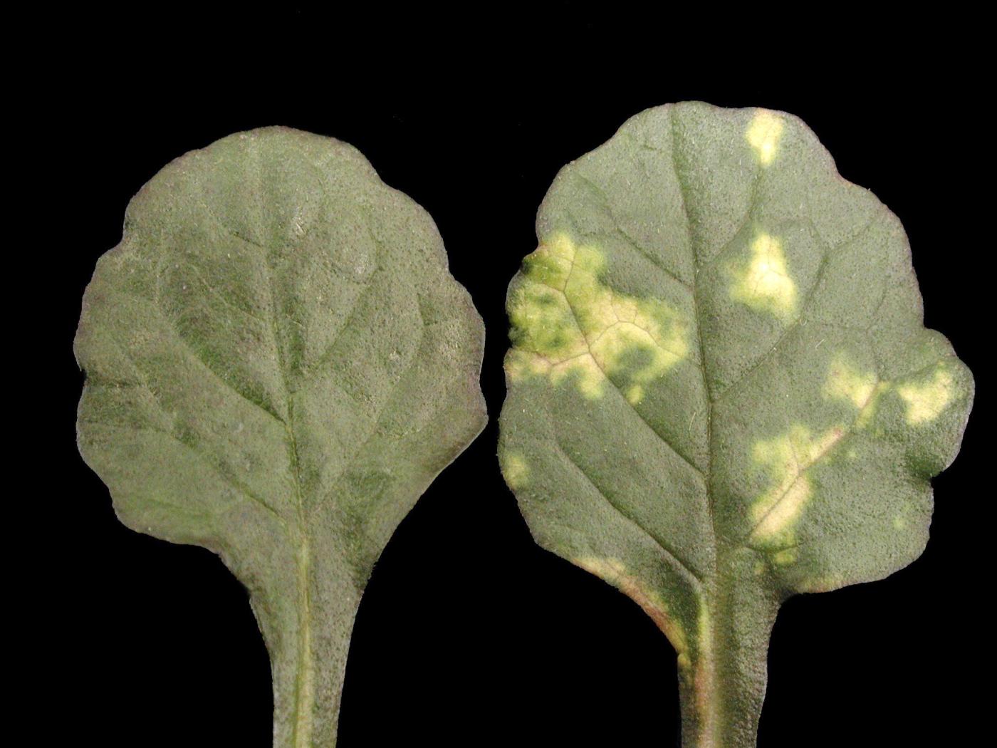 Légende: Comparaison entre une feuille saine et affectée de bugle rampant