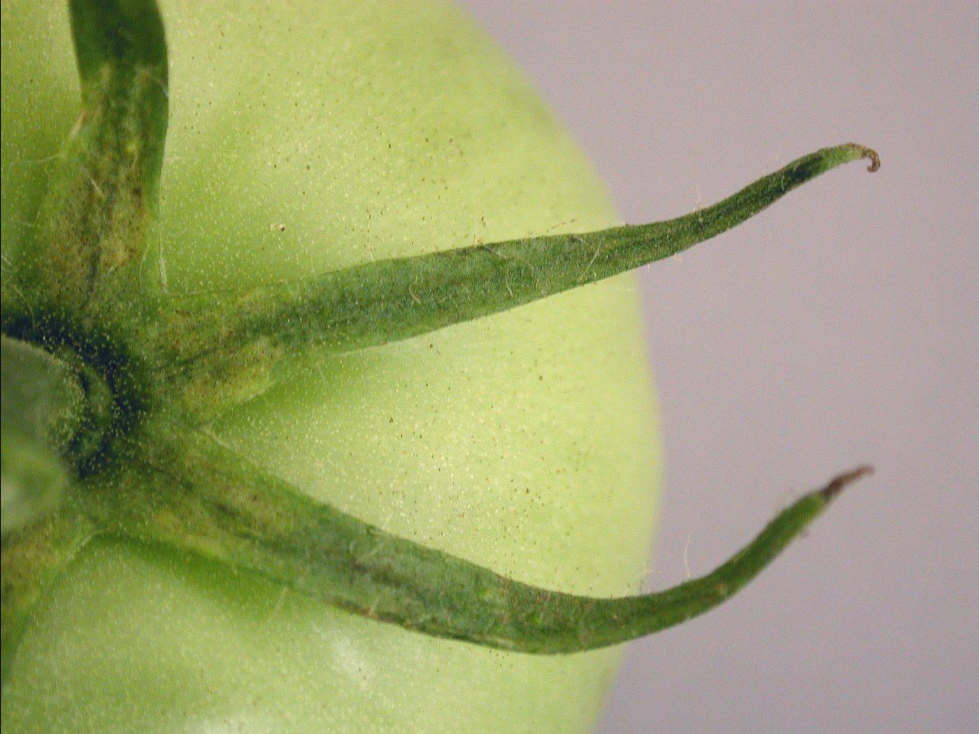 Description: Une tomate verte de serre (cv 'Trust') montre des sépales qui sont brunis à la base et à la pointe. Les tests de laboratoire ont révélé la présence du virus de la mosaïque du pépino (PepMV).