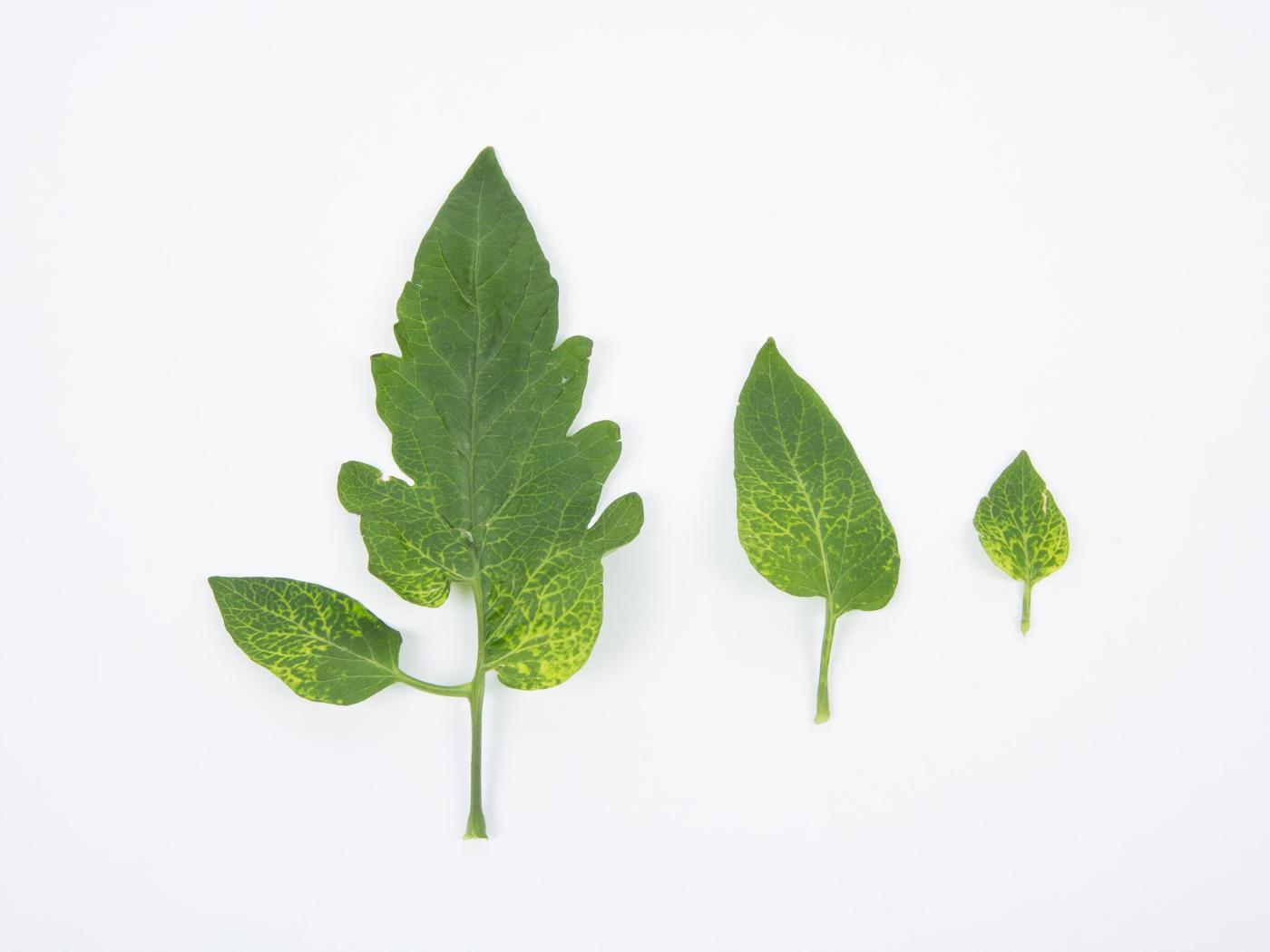 Description: Deux folioles de tomate de serre (cv 'Clermont') montrent un jaunissement vif situé entre les nervures, à l’apex des folioles, une marbrure vert pâle dans la partie basale et des brûlures beige rosé au centre des folioles. L’autre foliole exhibe une marbrure vert pâle au centre du limbe. Les tests de laboratoire ont révélé la présence du virus de la mosaïque du pépino (PepMV).